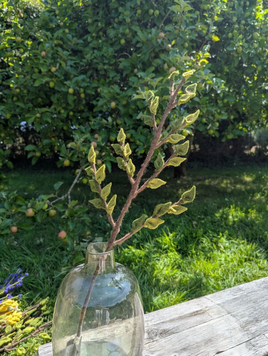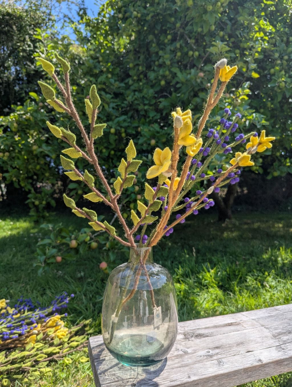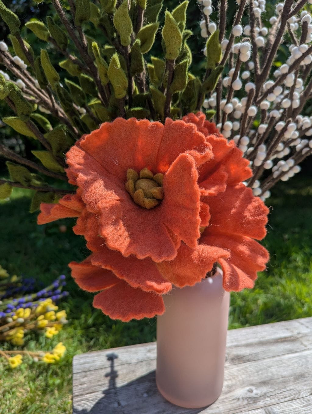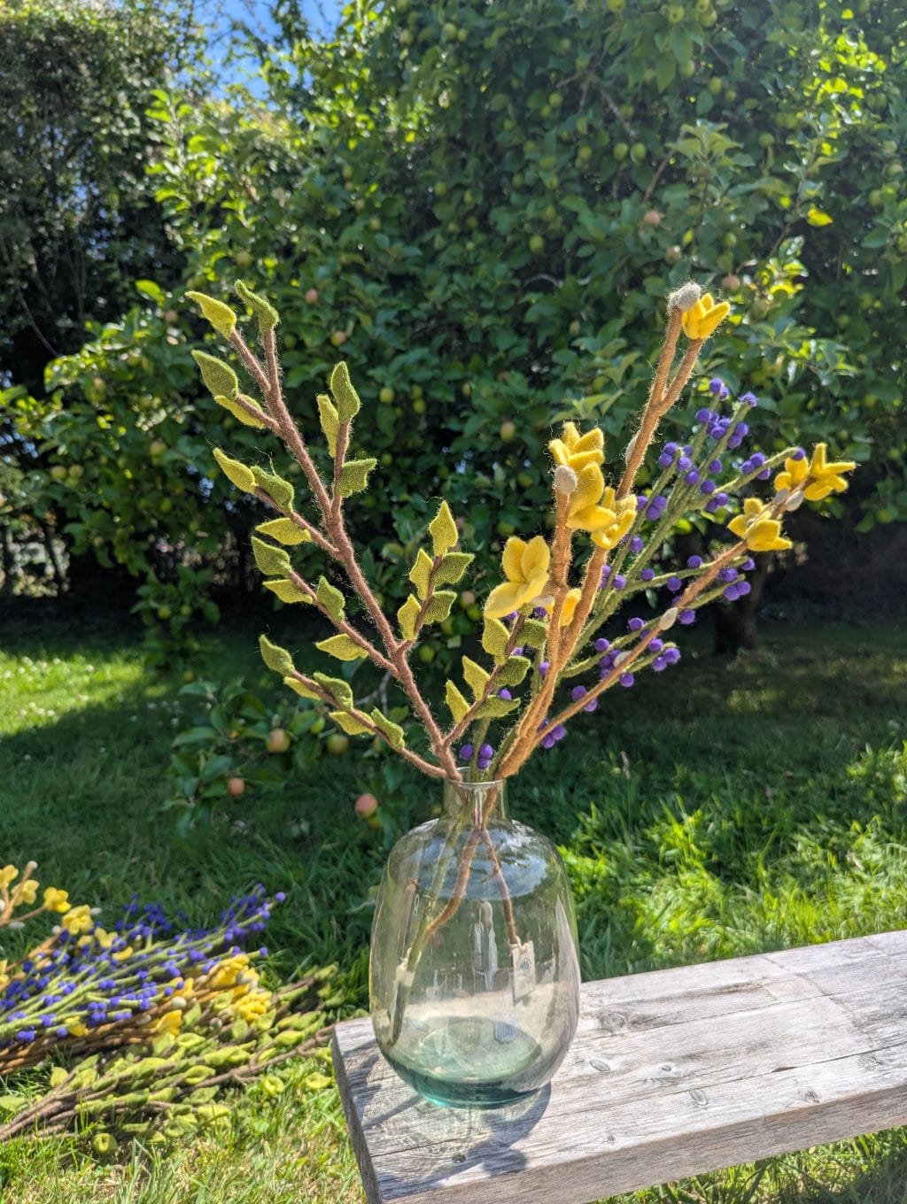 Cette branche verte constitue un excellent élément de base pour créer un bouquet sur mesure et le faire évoluer au fil des mois. Associez-la à des fleurs en feutre aux teintes douces ou vives pour varier les ambiances selon les saisons : cosmos, roses, branches avec baies, glycines, coquelicots, fleurs en boule… Elle peut aussi être utilisée dans des mises en scène végétale plus minimalistes, en solo ou en duo, dans un joli vase. Sa longueur généreuse permet des compositions majestueuses et aériennes.