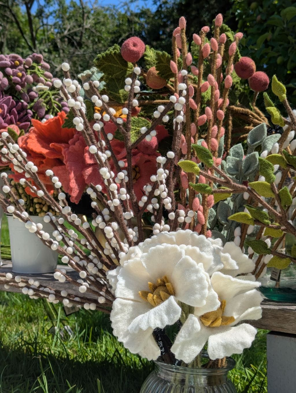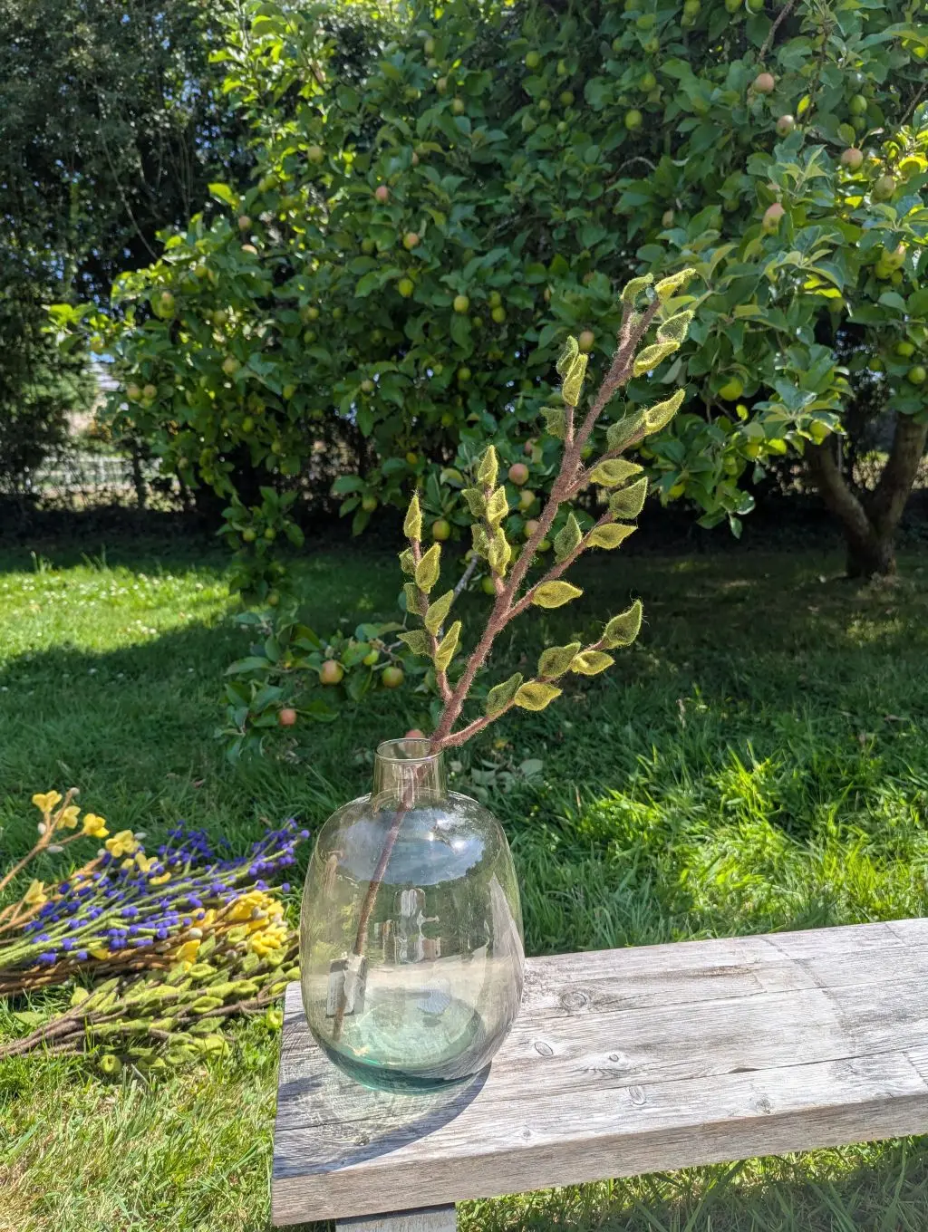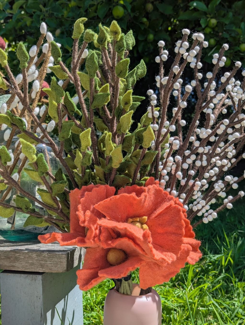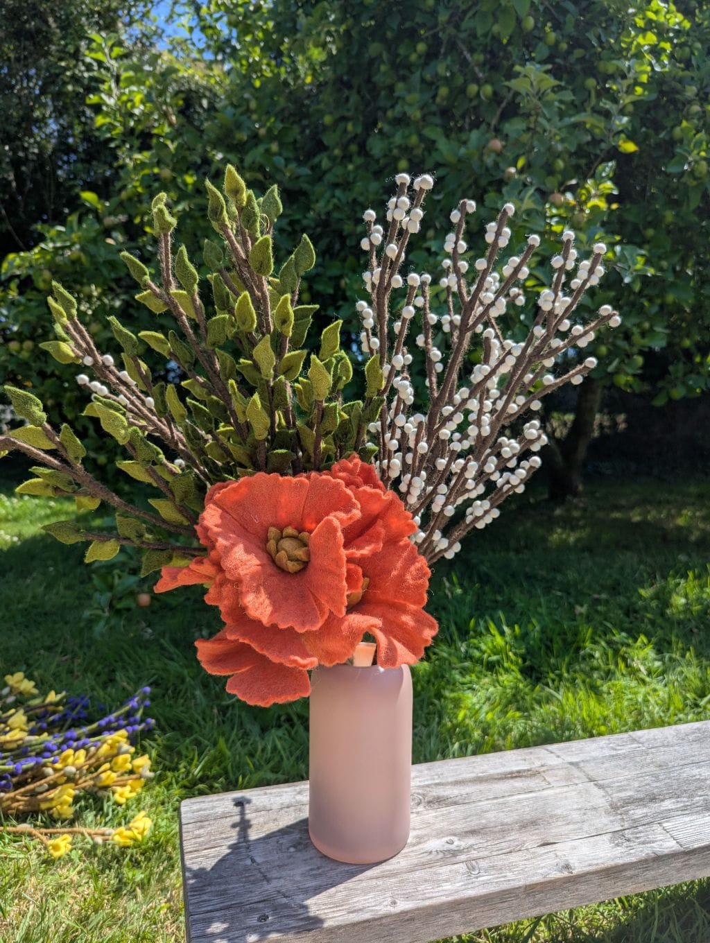 Cette branche verte constitue un excellent élément de base pour créer un bouquet sur mesure et le faire évoluer au fil des mois. Associez-la à des fleurs en feutre aux teintes douces ou vives pour varier les ambiances selon les saisons : cosmos, roses, branches avec baies, glycines, coquelicots, fleurs en boule… Elle peut aussi être utilisée dans des mises en scène végétale plus minimalistes, en solo ou en duo, dans un joli vase. Sa longueur généreuse permet des compositions majestueuses et aériennes.