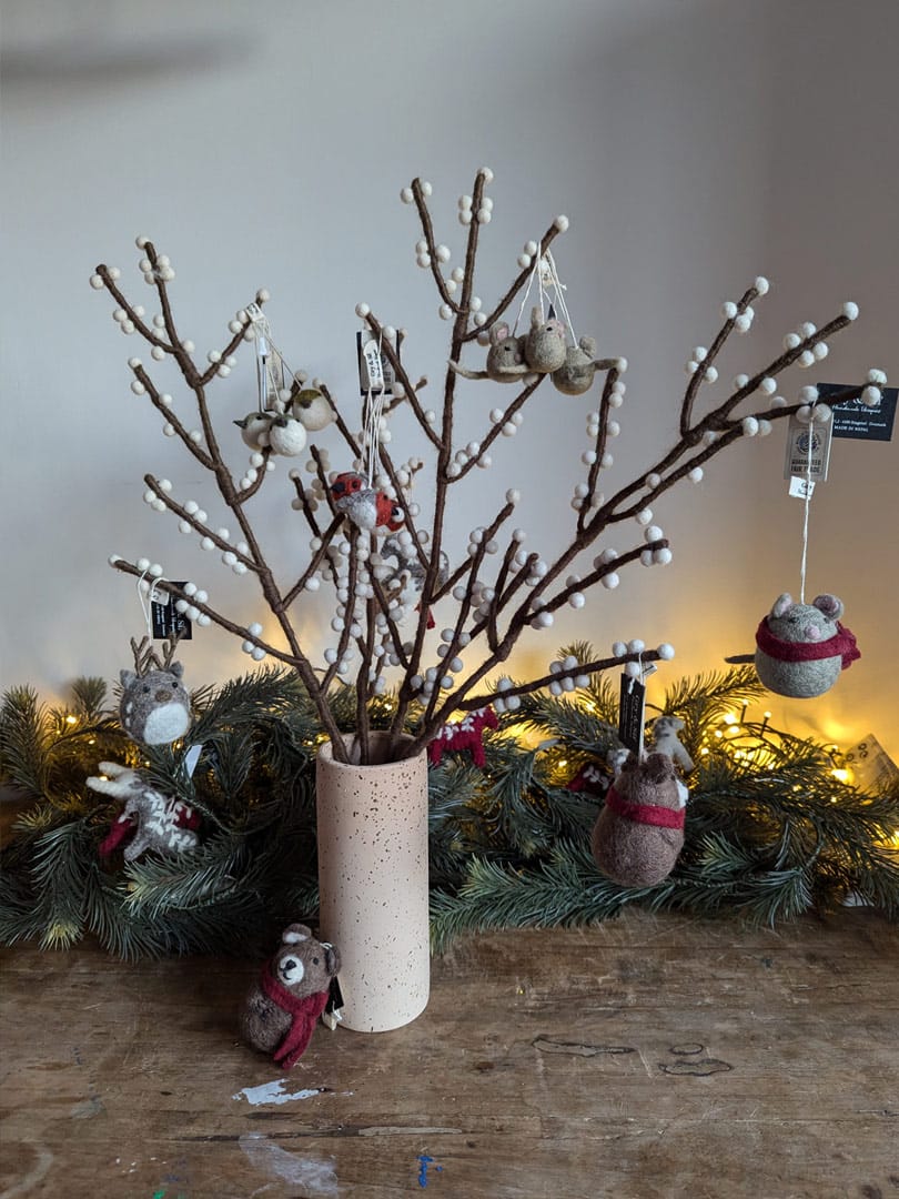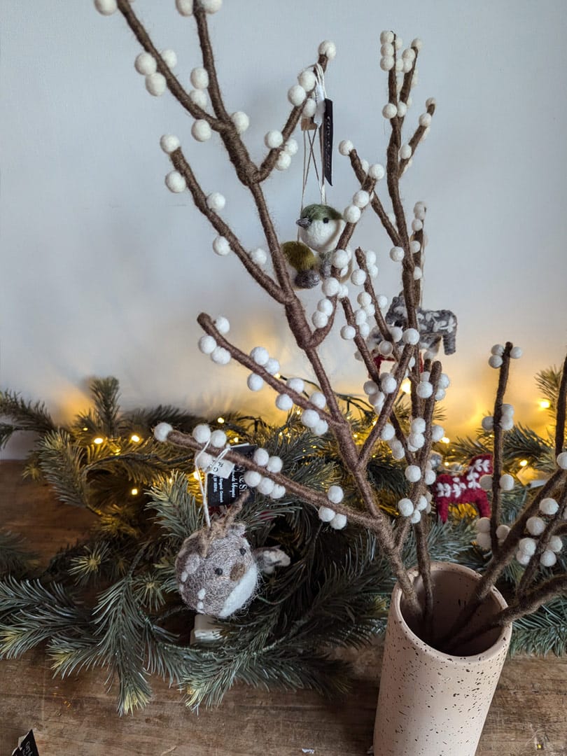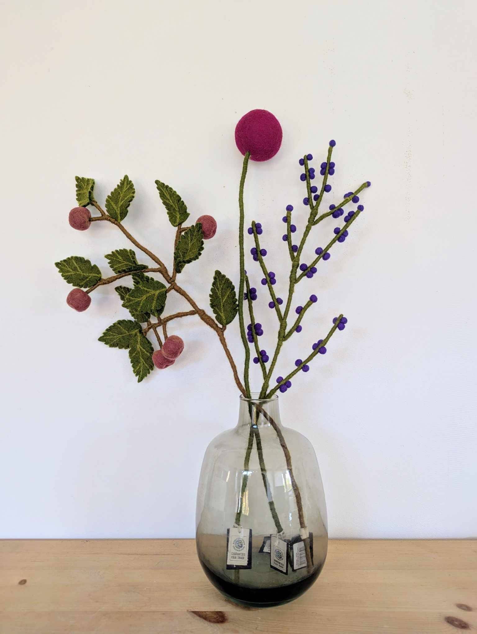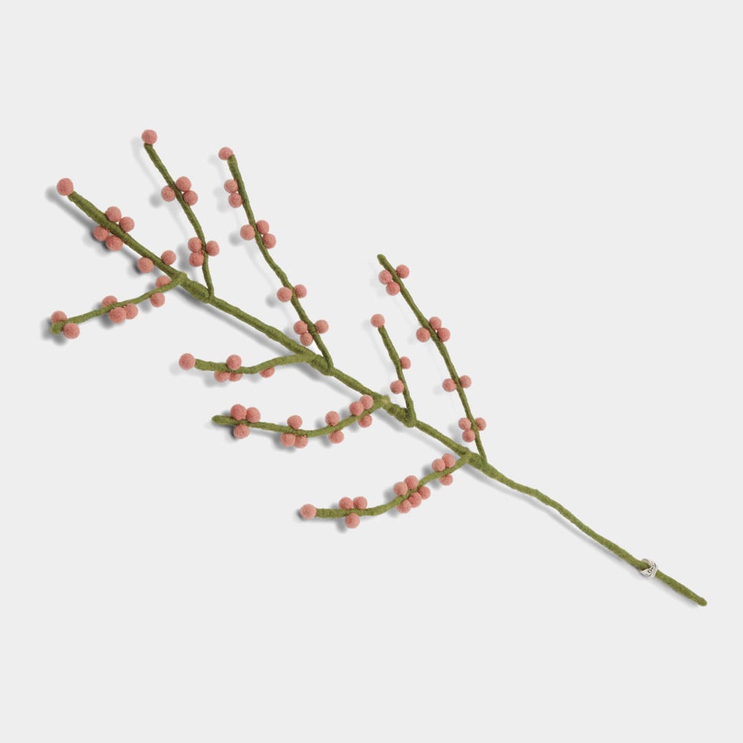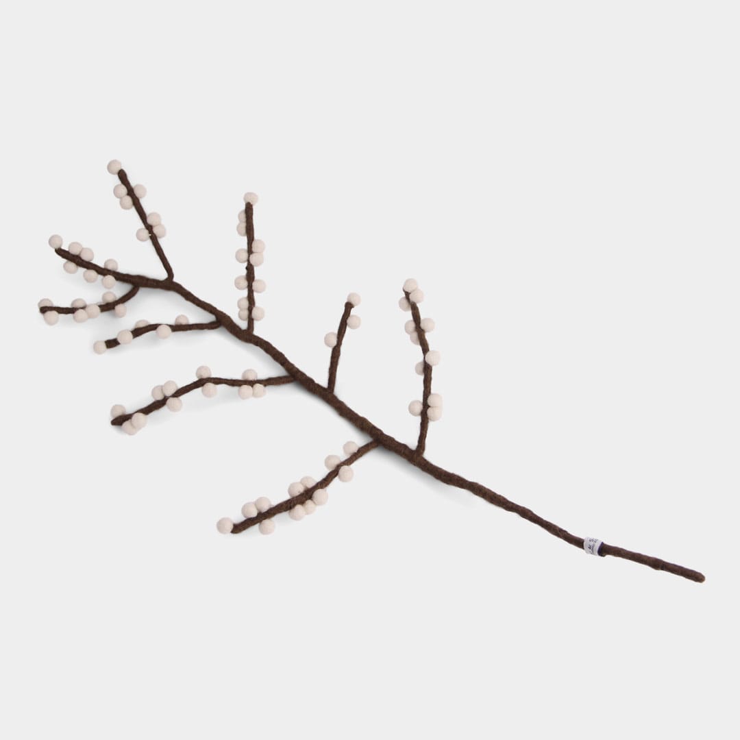 Comme l’ensemble des créations Gry & Sif, cette branche de baies est entièrement fabriquée à la main au Népal, dans le cadre d’un partenariat équitable WFTO. Chaque élément se compose de laine de mouton issue d’élevages responsables. Derrière chaque branche, se cache donc le geste précis et patient d’une artisane pour donner naissance à un objet unique et porteur de sens. La branche de baies en feutre constitue une alternative durable et poétiques aux fleurs éphémères.