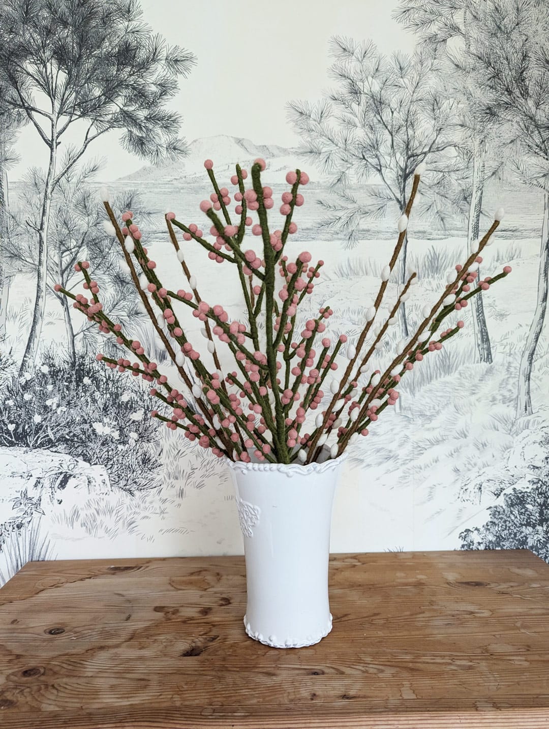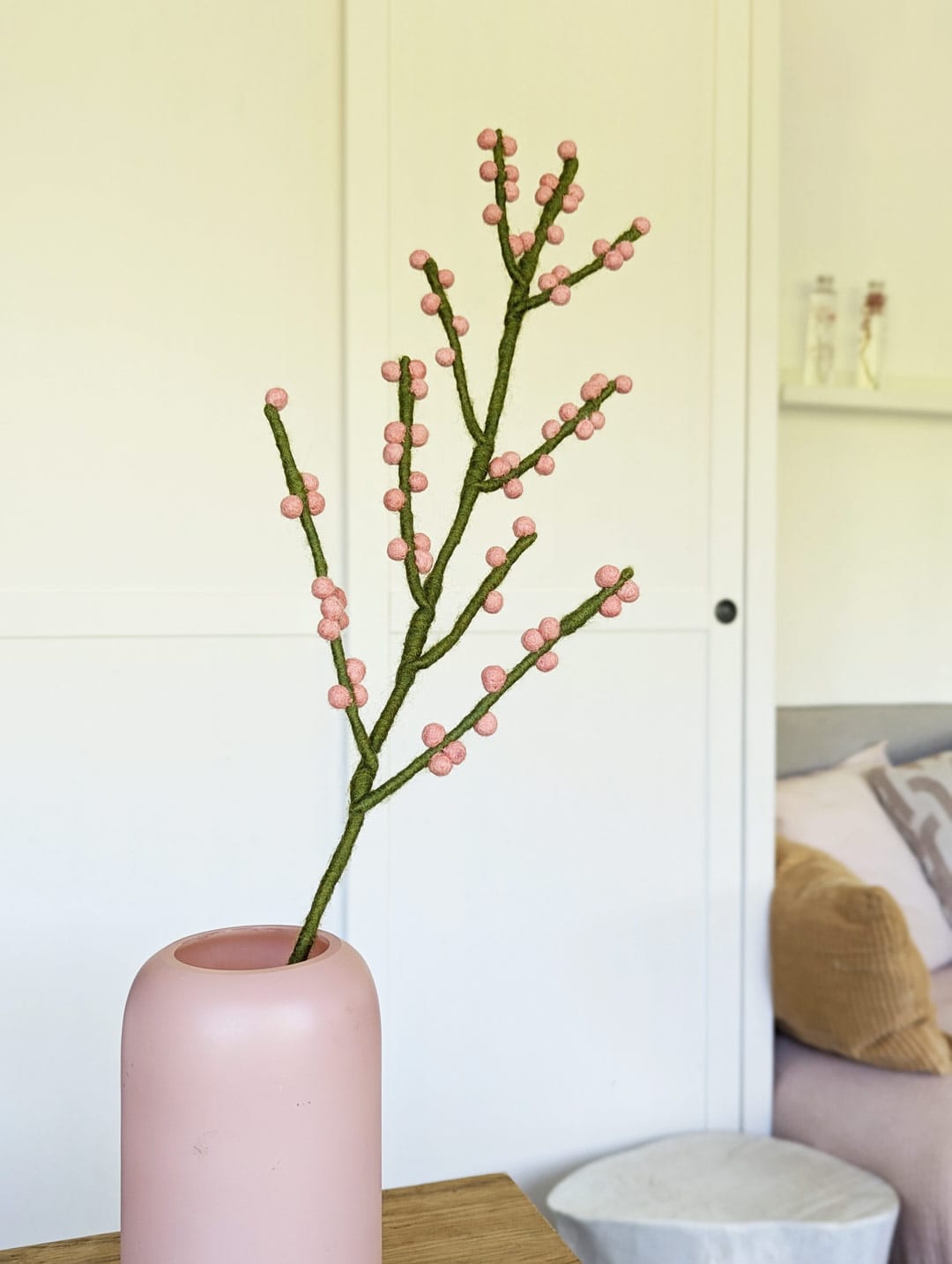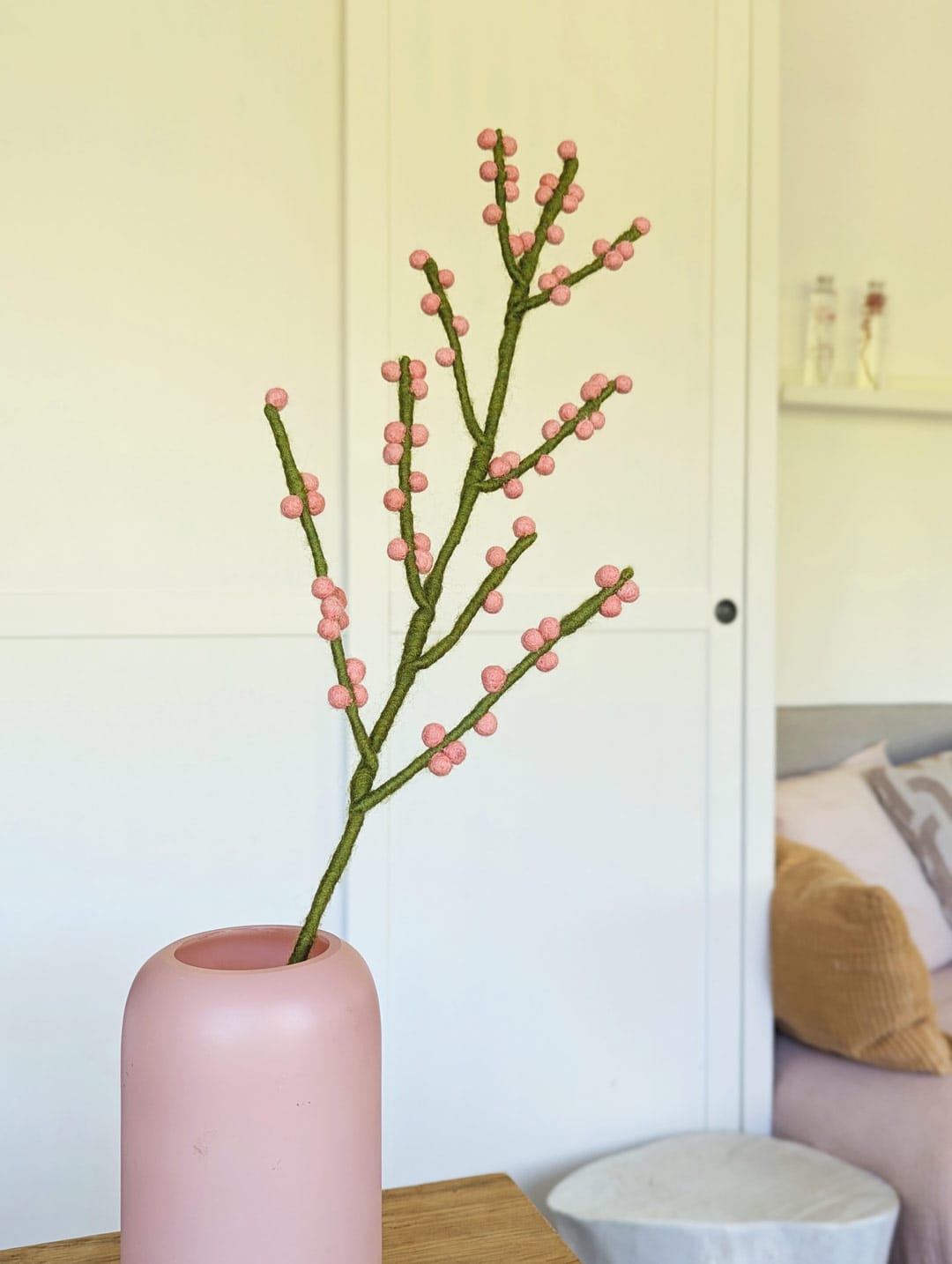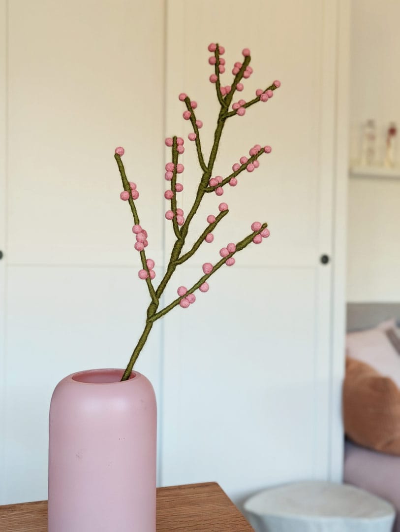 Grâce à sa tige longue et souple, cette branche de baies en feutre s’adapte facilement à toutes les mises en scène. Placez-la dans un vase haut, mêlée à des cosmos ou à des feuillages, déposez-la délicatement au centre d’une jolie table, ou bien utilisez-la pour y accrocher des petites décorations à suspendre. Réutilisable à l’infini, adaptable au gré des saisons et sans entretien, elle vous aide à faire évoluer votre décoration au gré de vos envies.