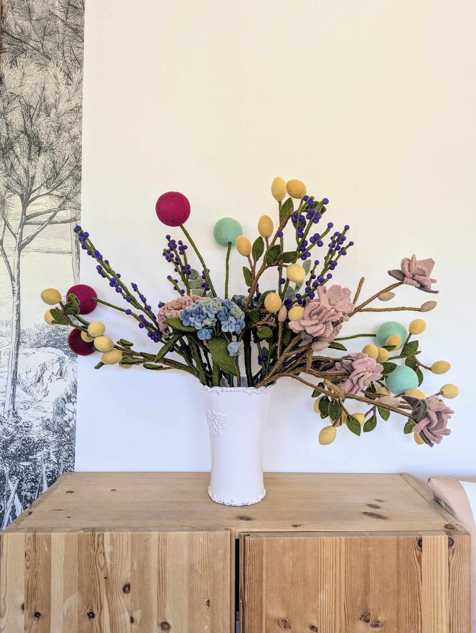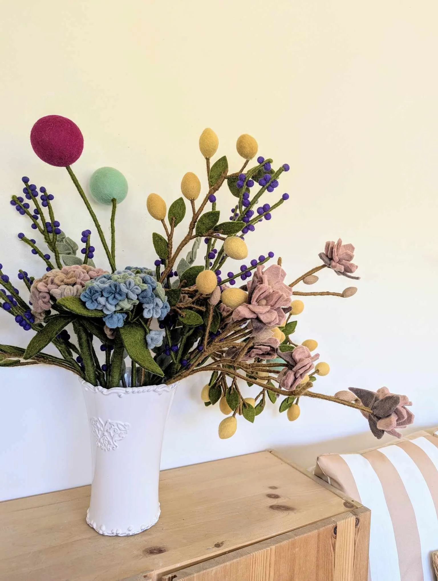 Fabriqué à la main avec une laine néo-zélandaise soigneusement sélectionnée, ce produit incarne une alternative responsable aux bouquets éphémères. Il ne s’use pas et s’intègre durablement dans votre décor grâce à un style intemporel : il vit avec vous de nombreuses années. Grâce à sa qualité de fabrication et à la noblesse de ses matériaux, il traverse les années sans perdre de sa beauté. Et si vous cherchez à consommer autrement, cette pièce s’inscrit parfaitement dans une démarche plus consciente et respectueuse grâce à sa certification WFTO (Wold Fare Trade Organization).
