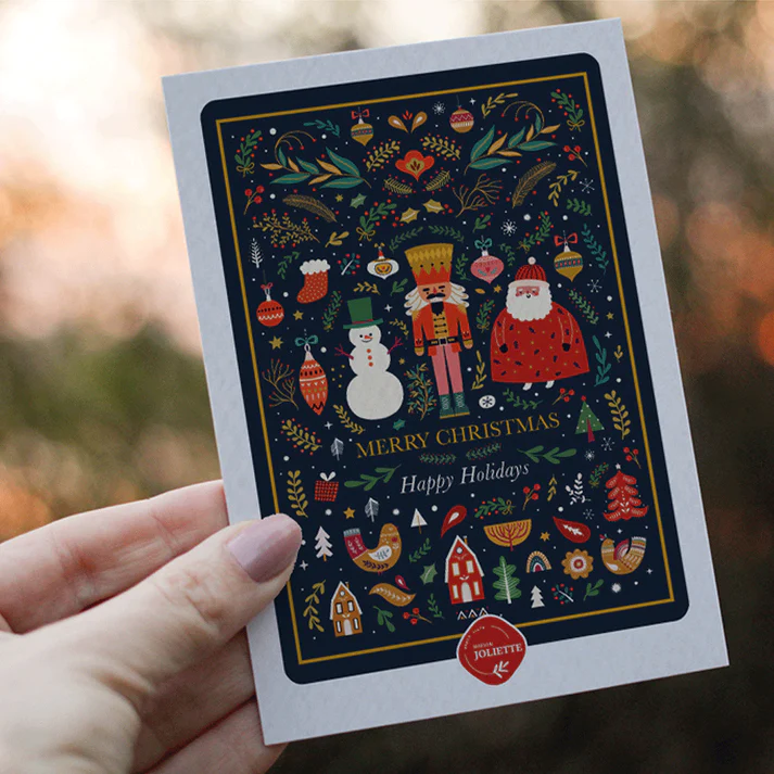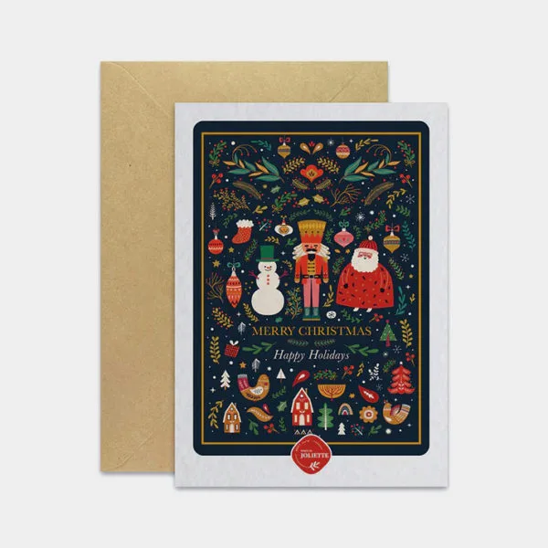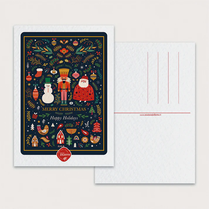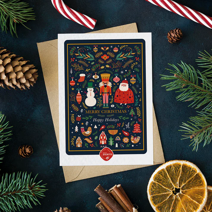 Cette belle carte Casse-noisette #1 de Maison Joliette reprend une multitude d’éléments inspirant la saison des fêtes. Au centre un casse-noisette se trouve bien entouré du père-Noël et d’un bonhomme de neige. L’ensemble affiche les couleurs vives de Noël, contrastant élégamment avec un fond noir intense.