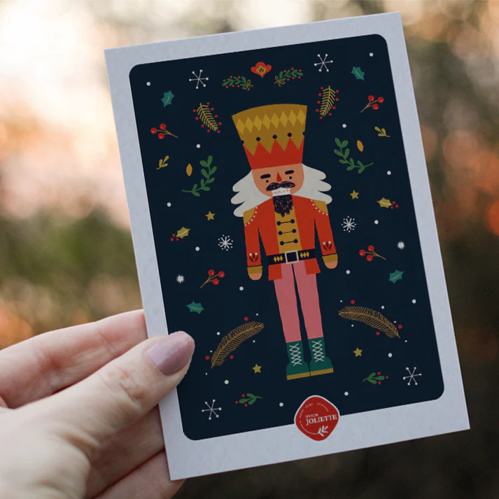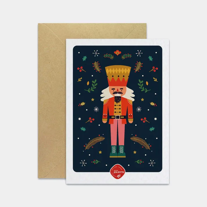 La carte Casse-noisette #2 de Maison Joliette a pour protagoniste le traditionnel casse-noisette. Cette figure est modernisée par des traits actualisés et des coloris modernes. Tout autour, feuilles de houx, branches de sapins, étoiles et flocons composent un décor de Noël évocateur.