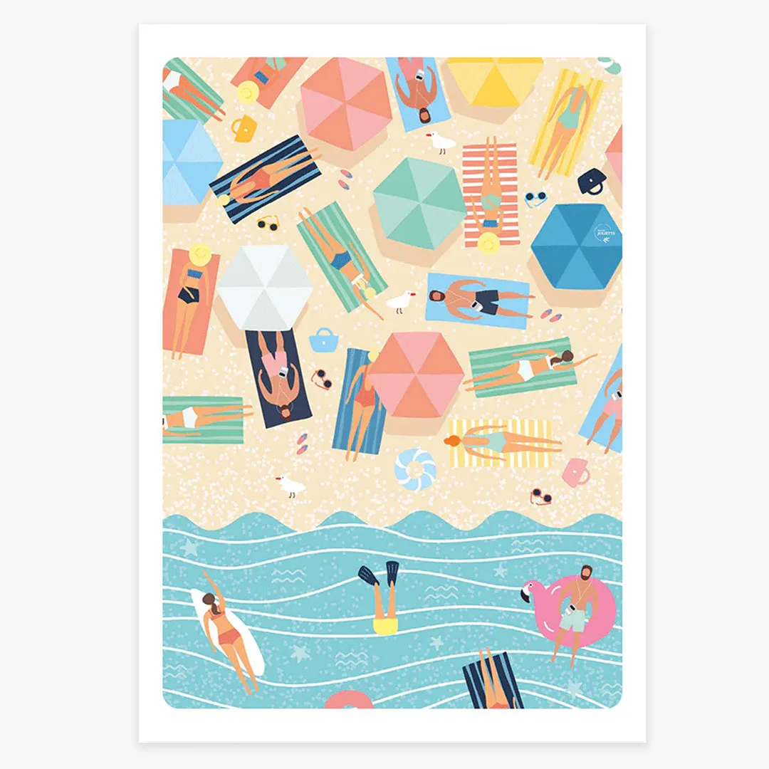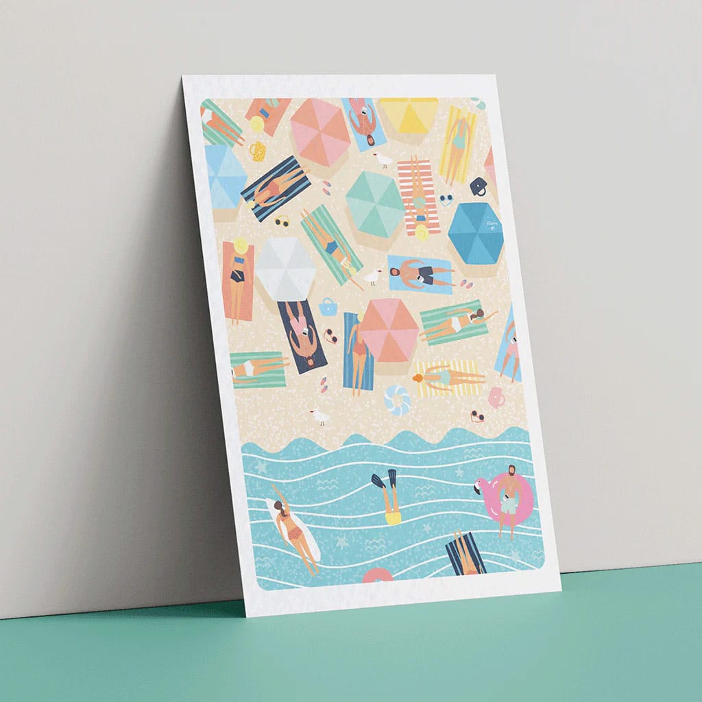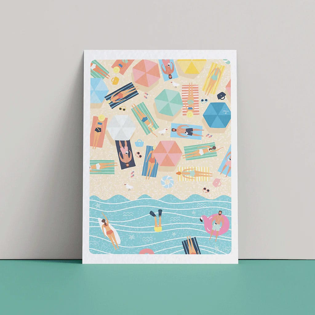 Sous un trait naïf, l’affiche Chill & Plouf (format A4 – 21 x 29,7 cm) de Maison Joliette dépeint une scène estivale de détente en bord de mer. Au milieu des serviettes, maillots et parasols colorés, les baigneurs et les bronzeurs habitent une plage bien remplie.