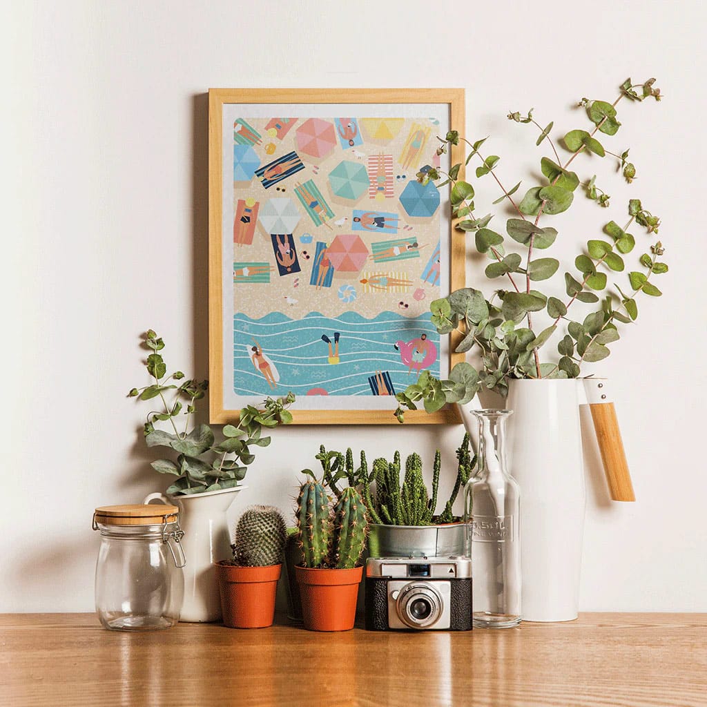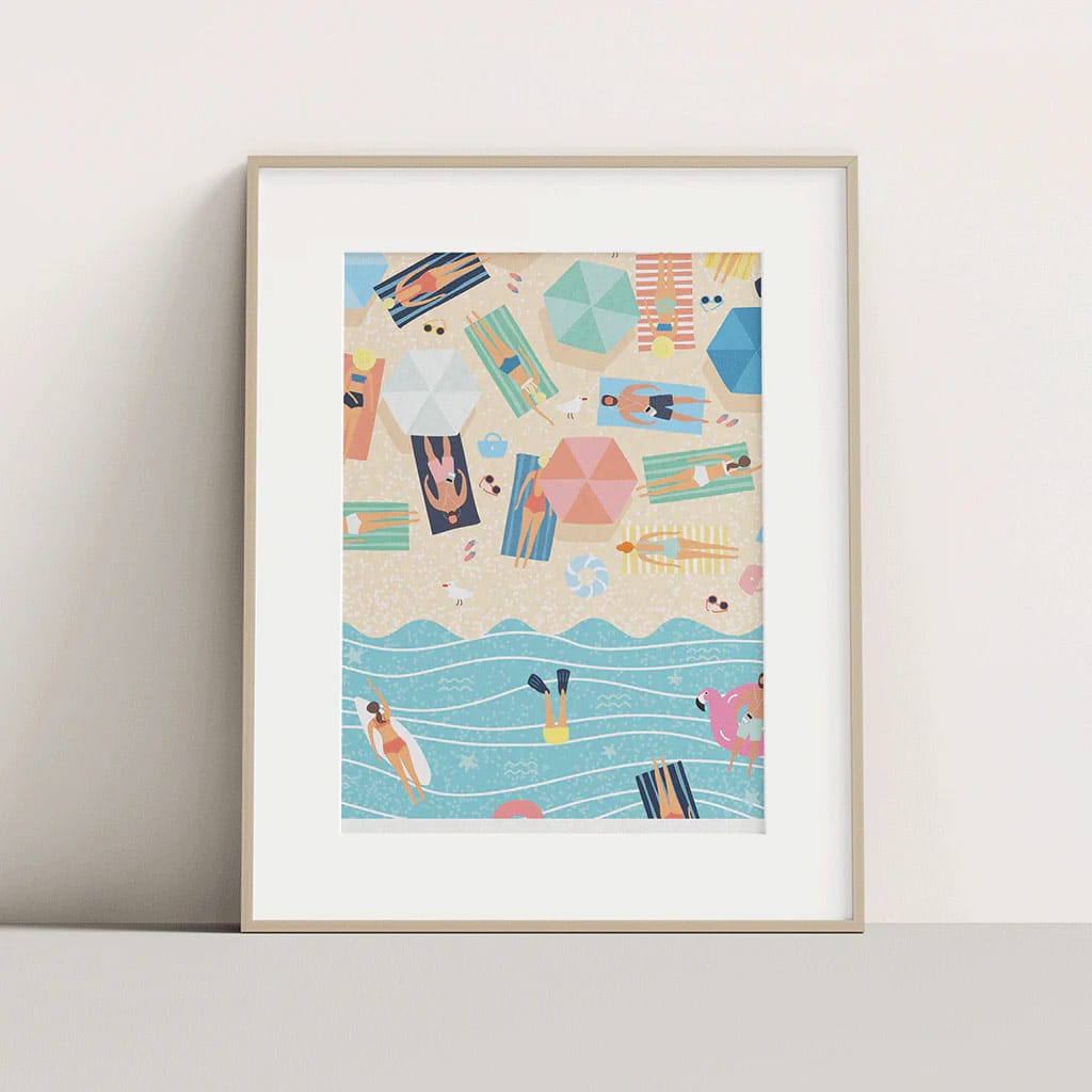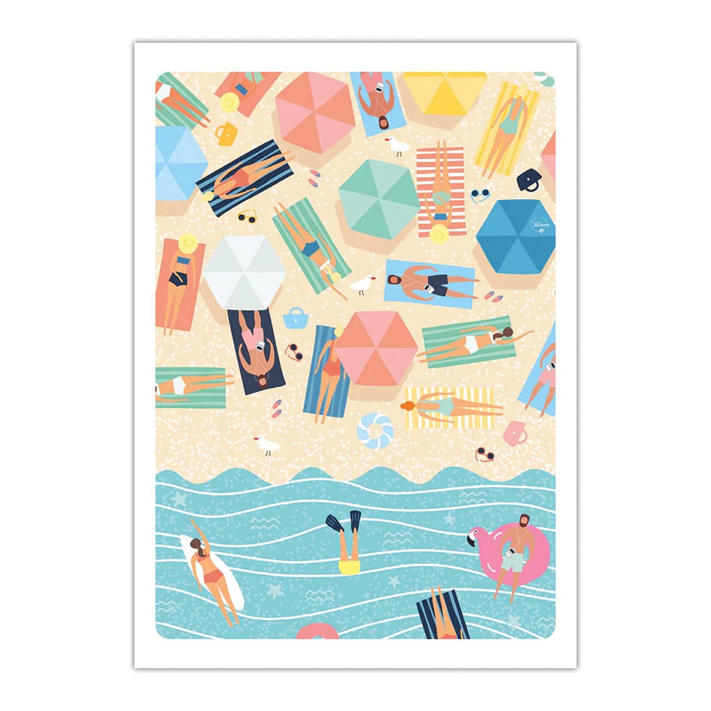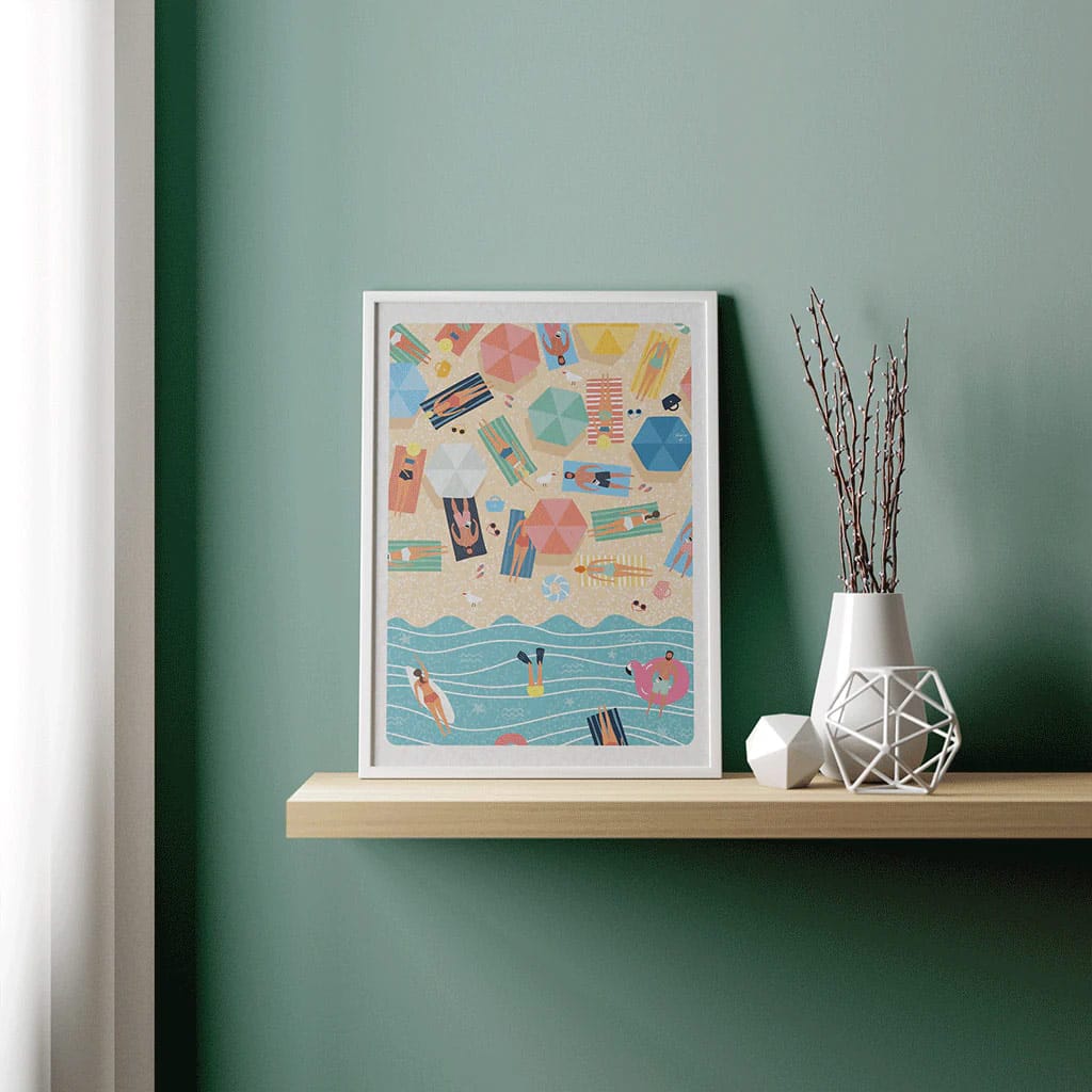 Sous un trait naïf, l’affiche Chill & Plouf (format A4 – 21 x 29,7 cm) de Maison Joliette dépeint une scène estivale de détente en bord de mer. Au milieu des serviettes, maillots et parasols colorés, les baigneurs et les bronzeurs habitent une plage bien remplie.