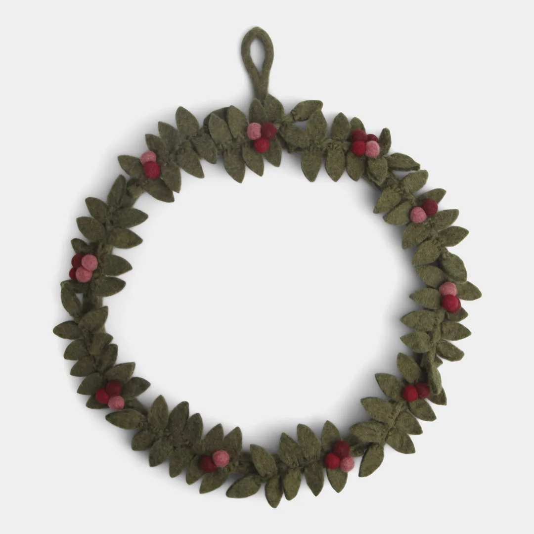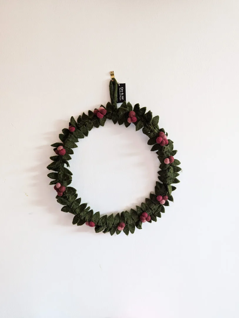 La couronne de baies rouges de Gry & Sif associe un feuillage vert foncé à de petites baies rouges et roses. Cette composition végétale hivernale, en feutre de laine, peut s’accrocher dans la maison tout au long de l’année, mais elle trouve particulièrement bien sa place sur votre porte à la période de Noël.