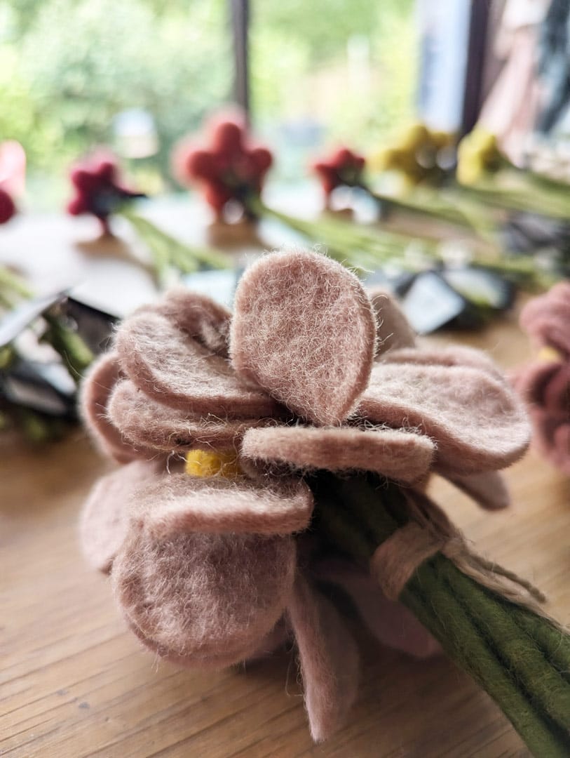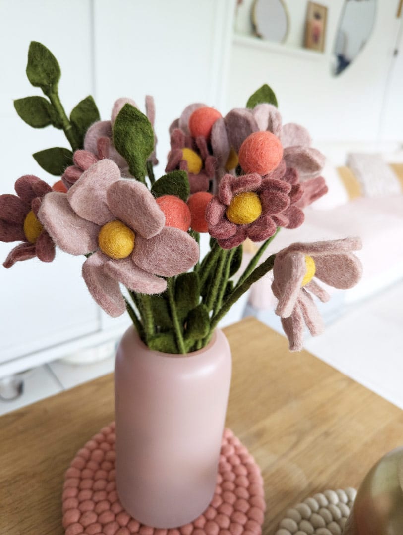 Composée de feutre de laine, elle dégage une beauté douce et chaleureuse. Cette matière naturelle et résistante garantit la durabilité de chaque brin, qui pourra rester dans un vase de nombreuses années sans se dégrader.