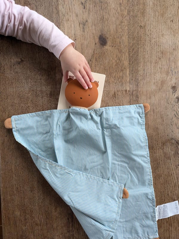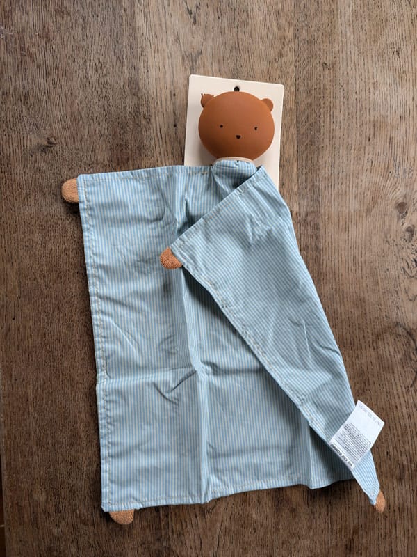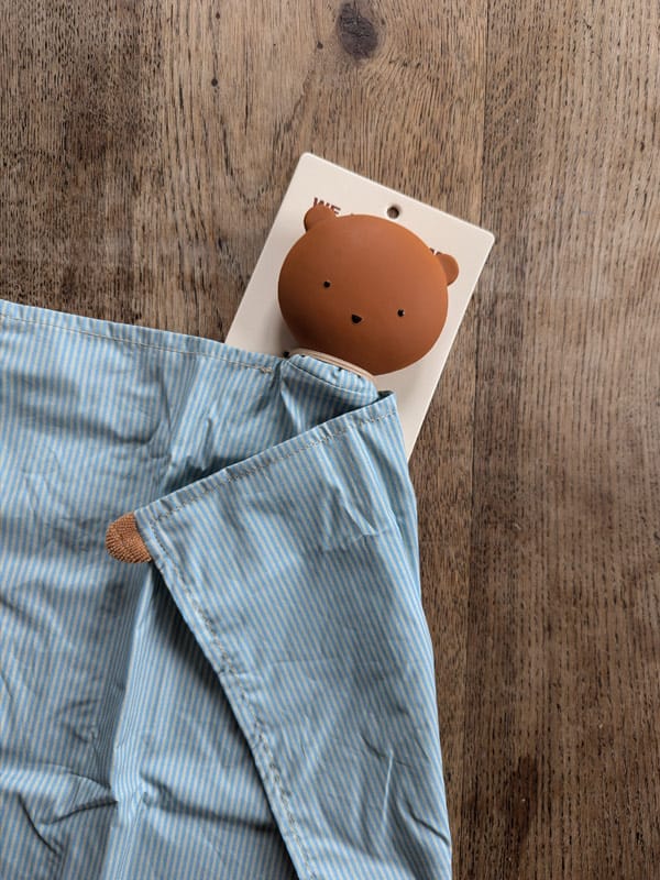 Son design simple et fonctionnel le rend facilement manipulable par les petites mains, et lui confère une esthétique minimaliste qui séduit les parents. Son corps est fait d’un joli tissu rayé bleu et blanc.