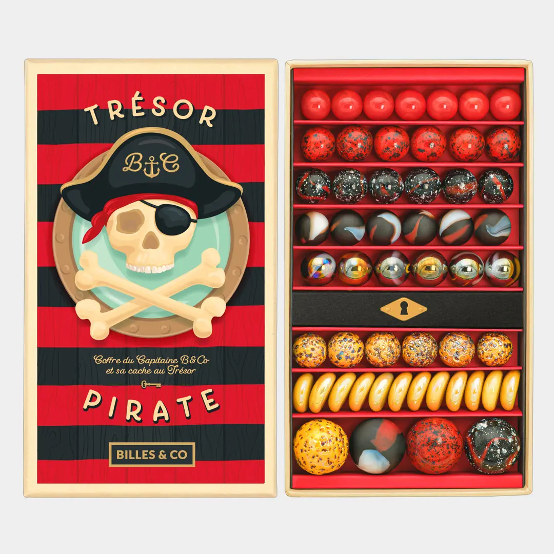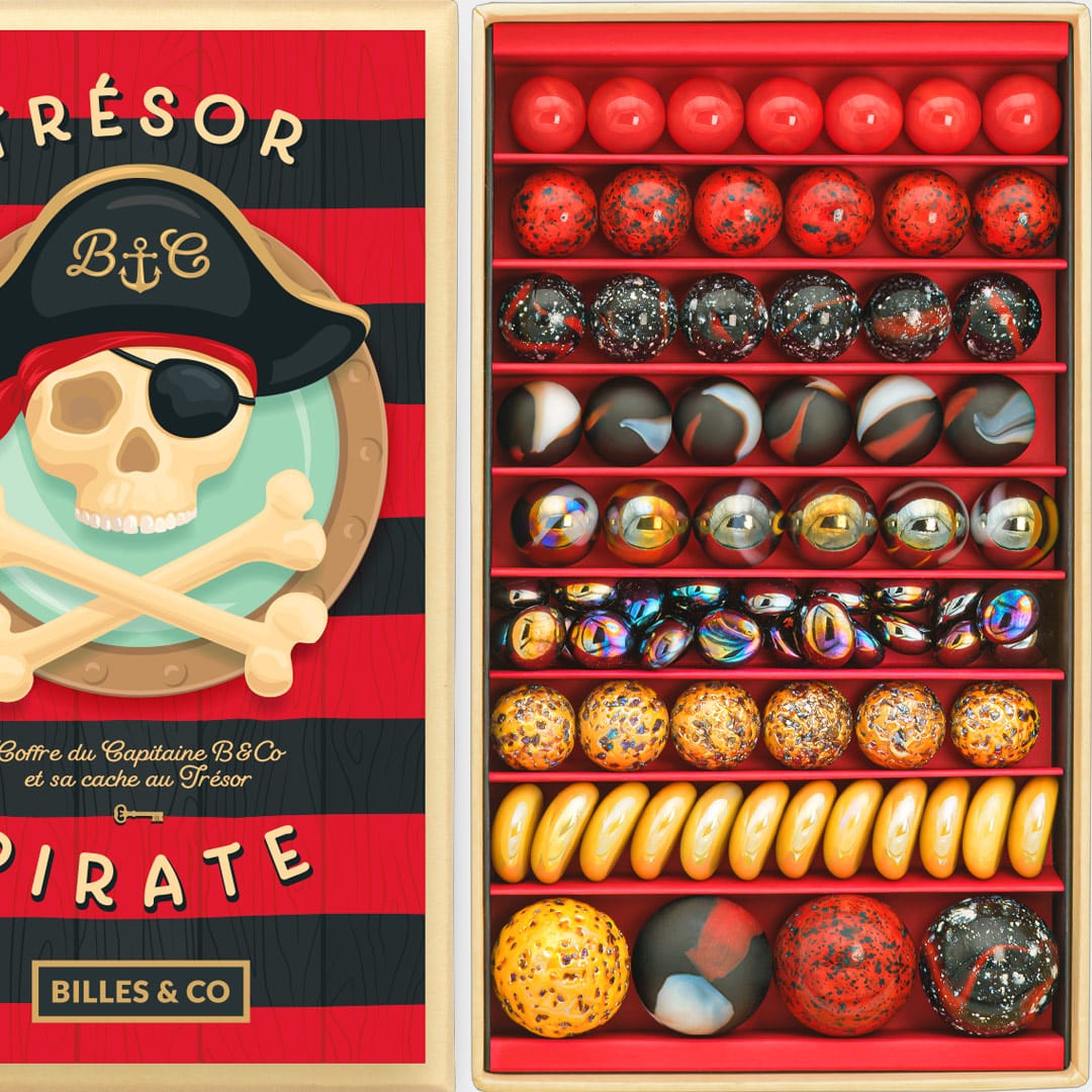 Billes & Co met un point d’honneur à présenter ses collections comme de véritables joyaux. Ici, les billes s’alignent dans une harmonie qui rappelle les pièces d’or, les drapeaux pirates et les bijoux perdus dans les soutes d’un navire.