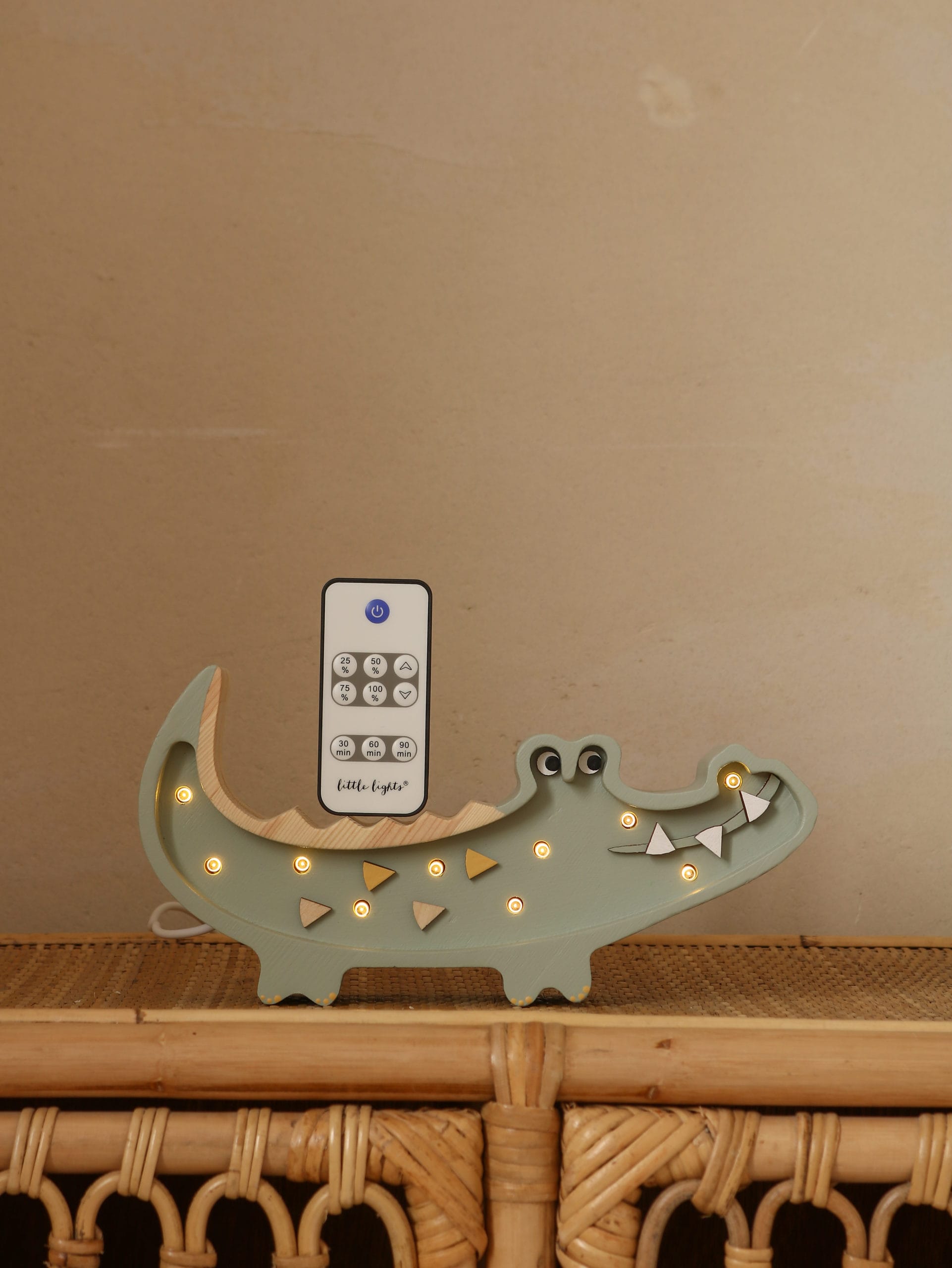Pour lire, jouer ou s’endormir, la mini lampe crocodile Kaki Pastel de Little Lights diffuse une lumière chaleureuse. Avec sa télécommande définissez un temps de fonctionnement (30, 60 ou 90 minutes) et réglez l’intensité lumineuse de 25 % à 100 %, selon vos besoins.