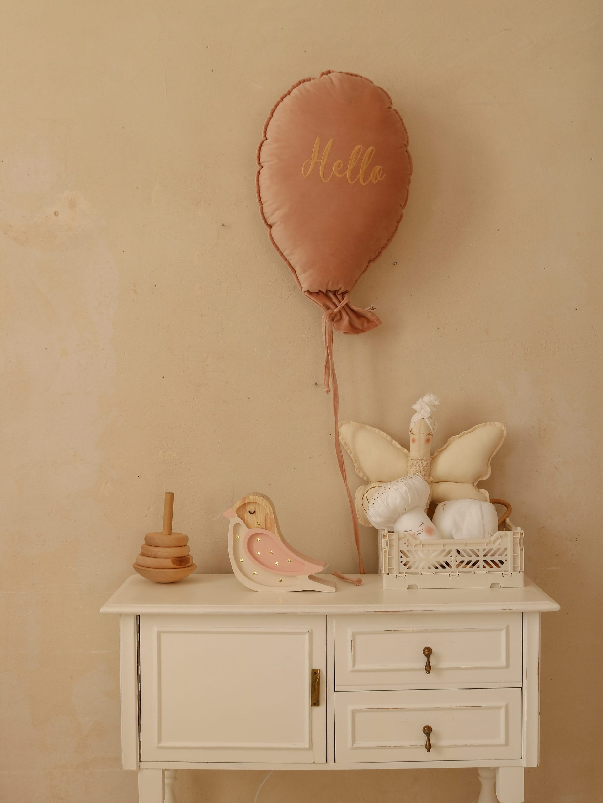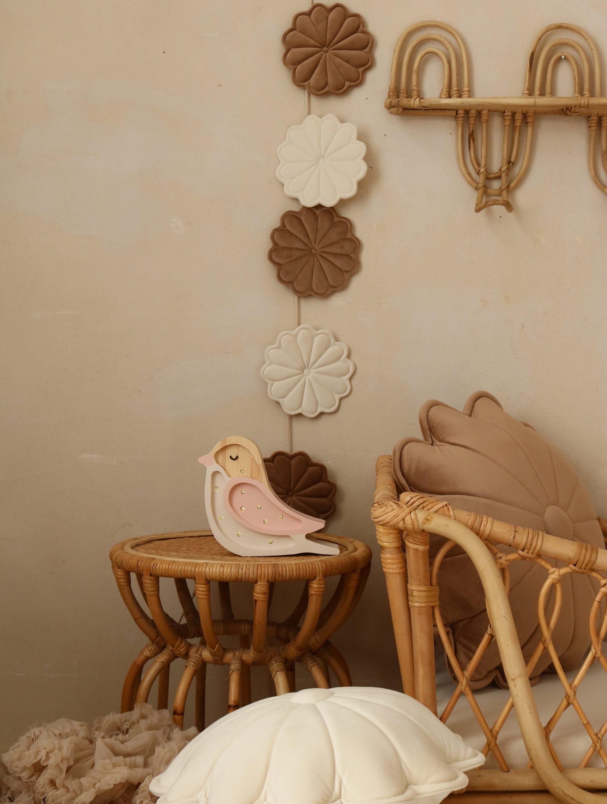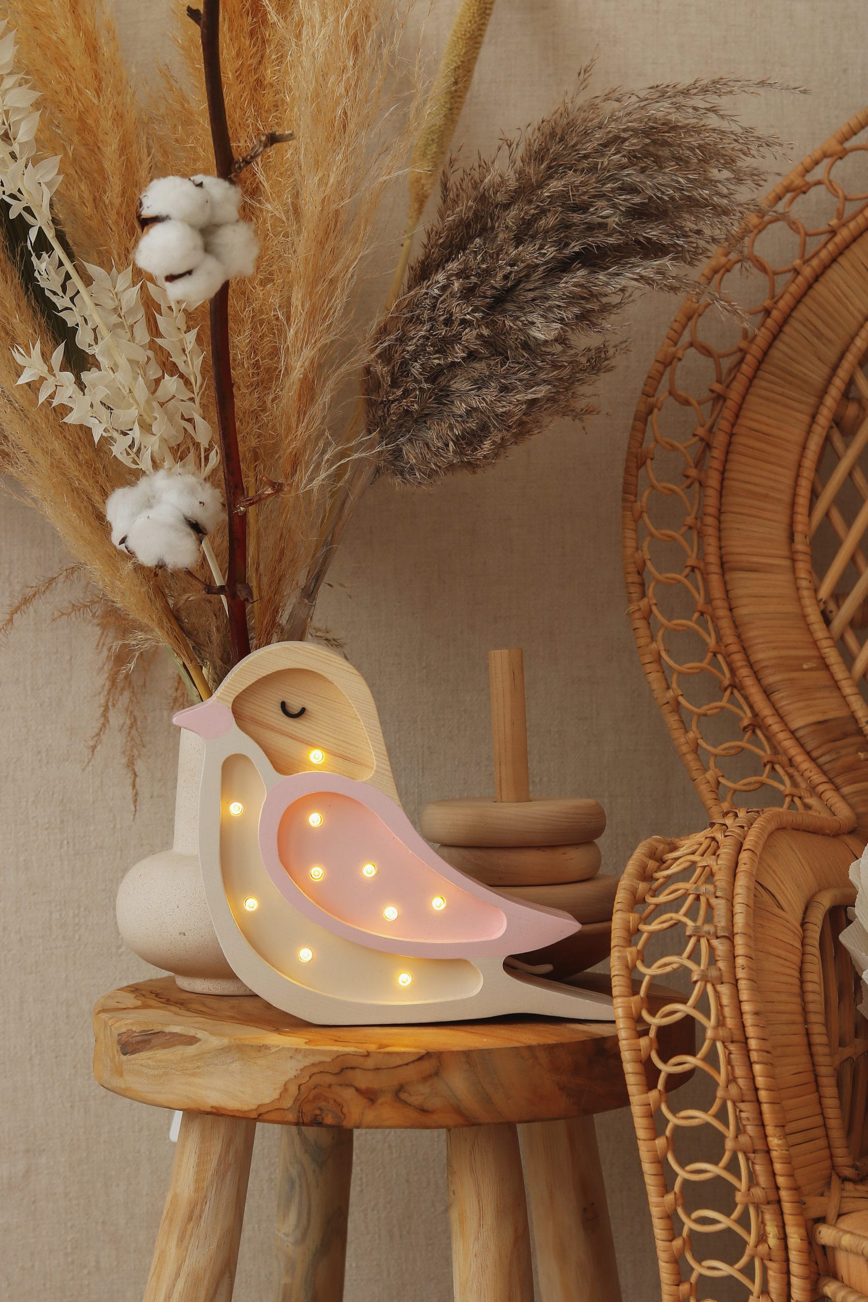 Le charme de la mini lampe veilleuse oiseau Strawberry Cream opère dans toutes les pièces de la maison. Que vous le déposiez sur la table de chevet de votre tout petit ou sur le buffet de votre salon, cette pièce décorative habite l’espace de son aura poétique.