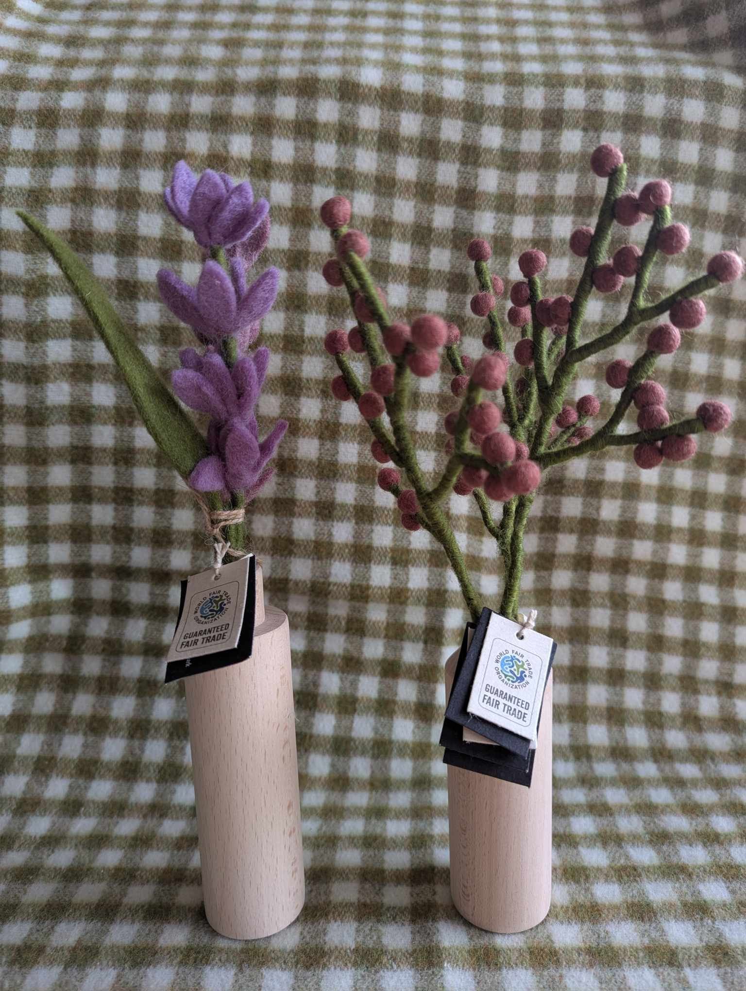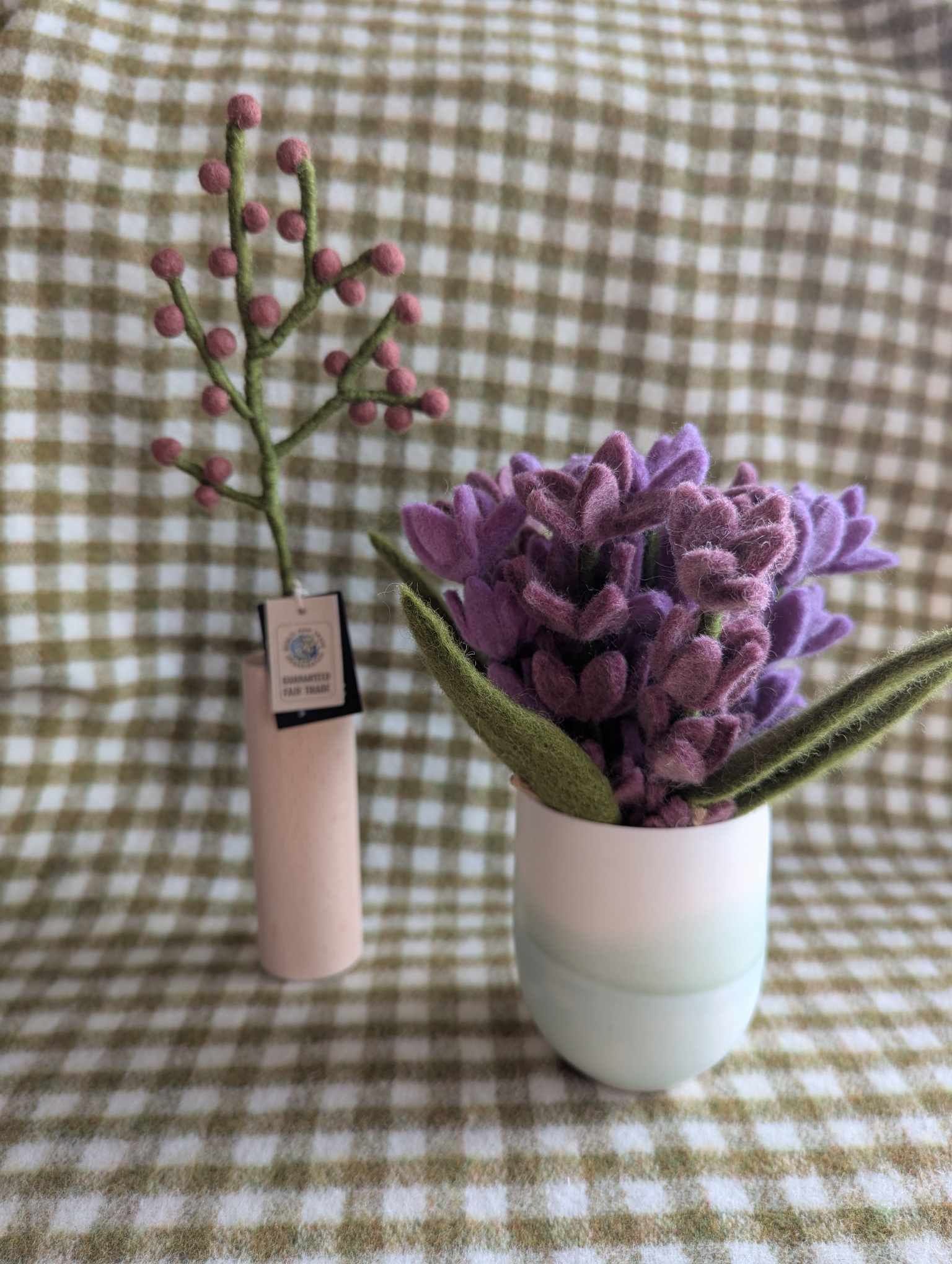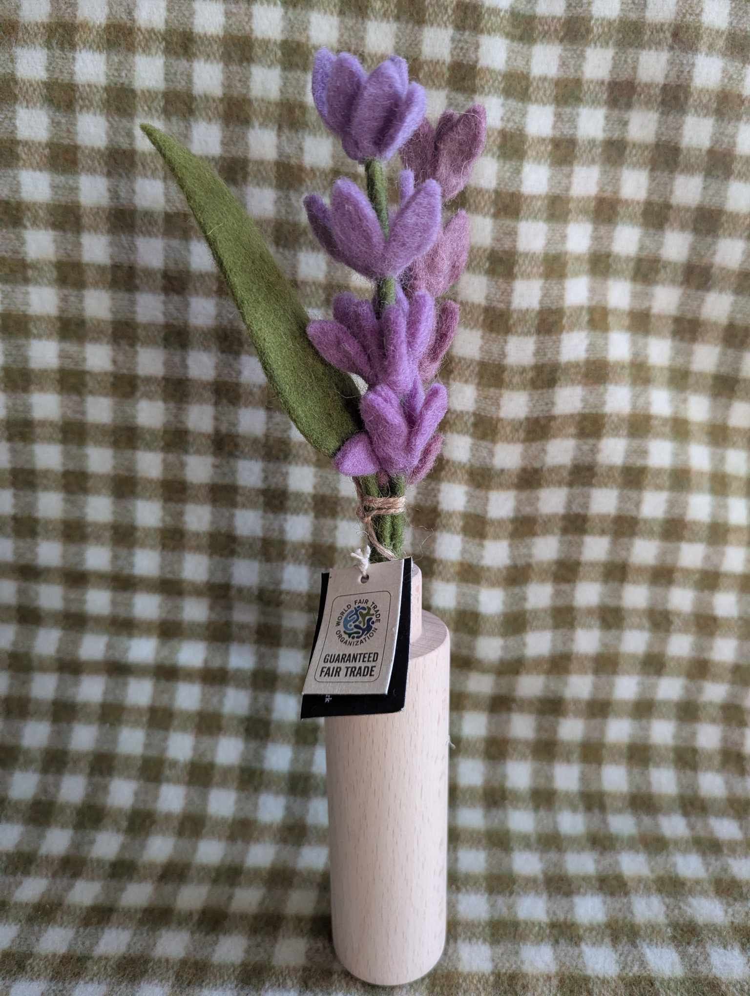 Cette lavande artificielle s’installe dans un joli soliflore ou dans un mini vase. Fabriquée en feutre de laine, elle reprend les lignes végétales avec douceur et chaleur. Ce mini bouquet durable est fabriqué à la main au Népal, à partir de laine néo-zélandaise de qualité, et bénéficie de la certification Fair Trade.
