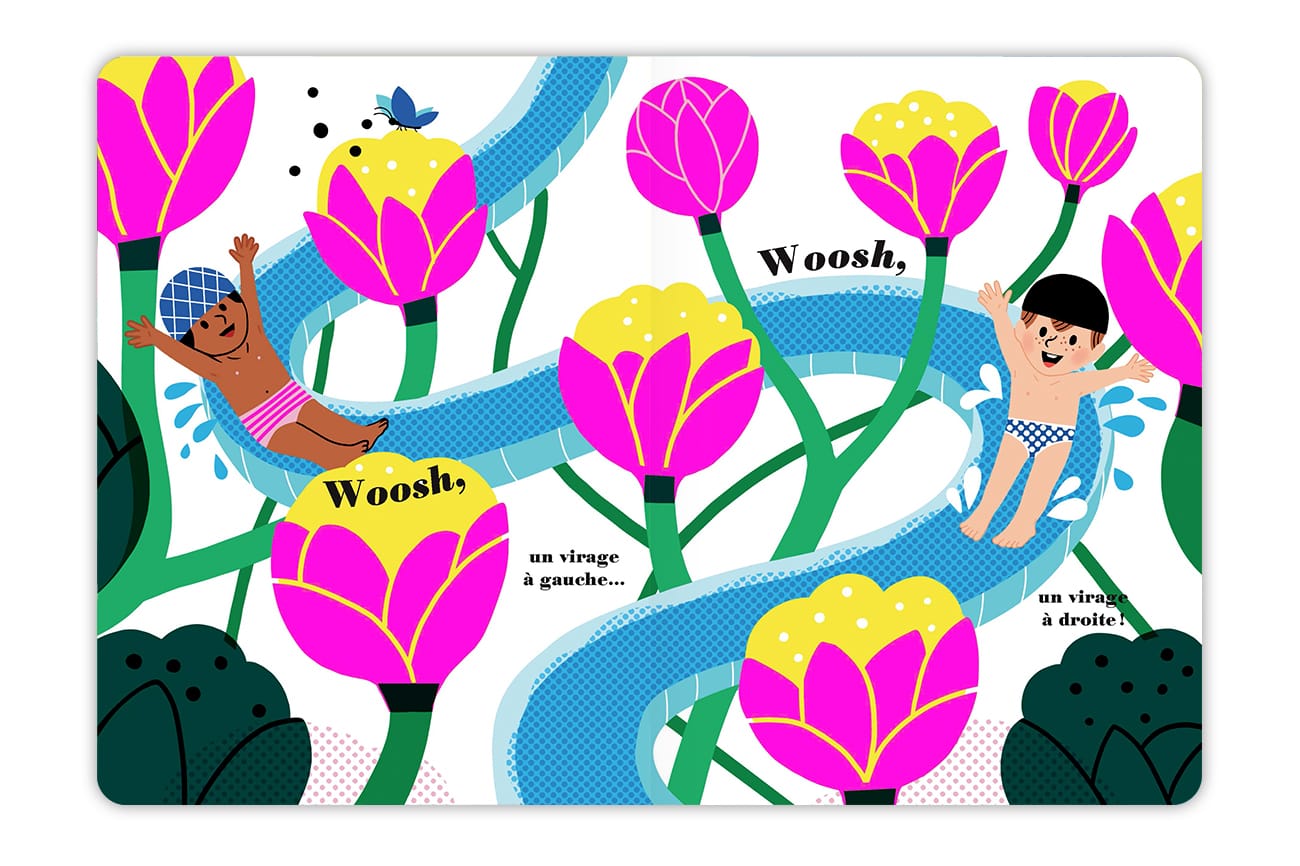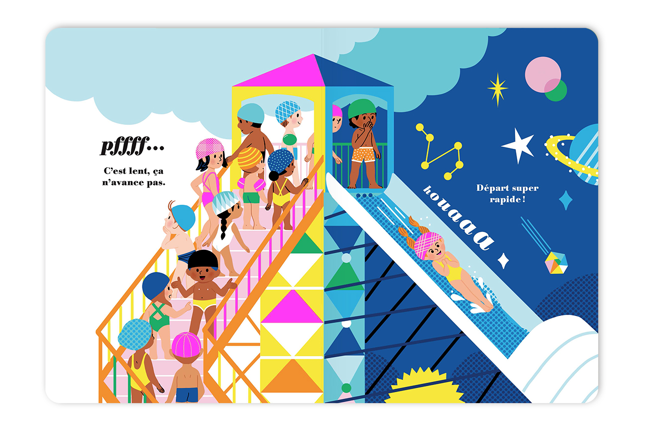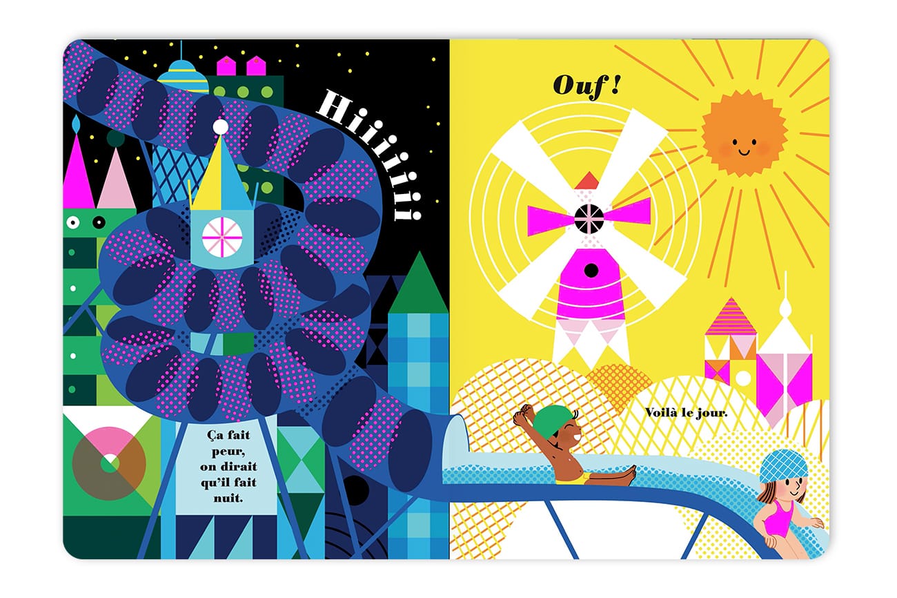 Ce livre en carton robuste séduit les plus jeunes par ses coloris acidulés et résiste très bien à leur enthousiasme lors de la manipulation. Il aborde la notion des contraires avec originalité. Ses visuels pop mènent à la rêverie. Véritable ouvrage sensoriel, il invite à prononcer des mots simples et onomatopées, ainsi qu’à suivre avec les doigts le chemin formé par le toboggan.