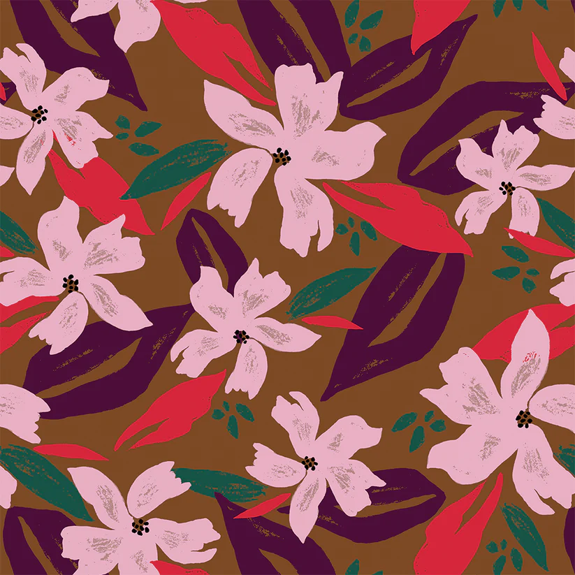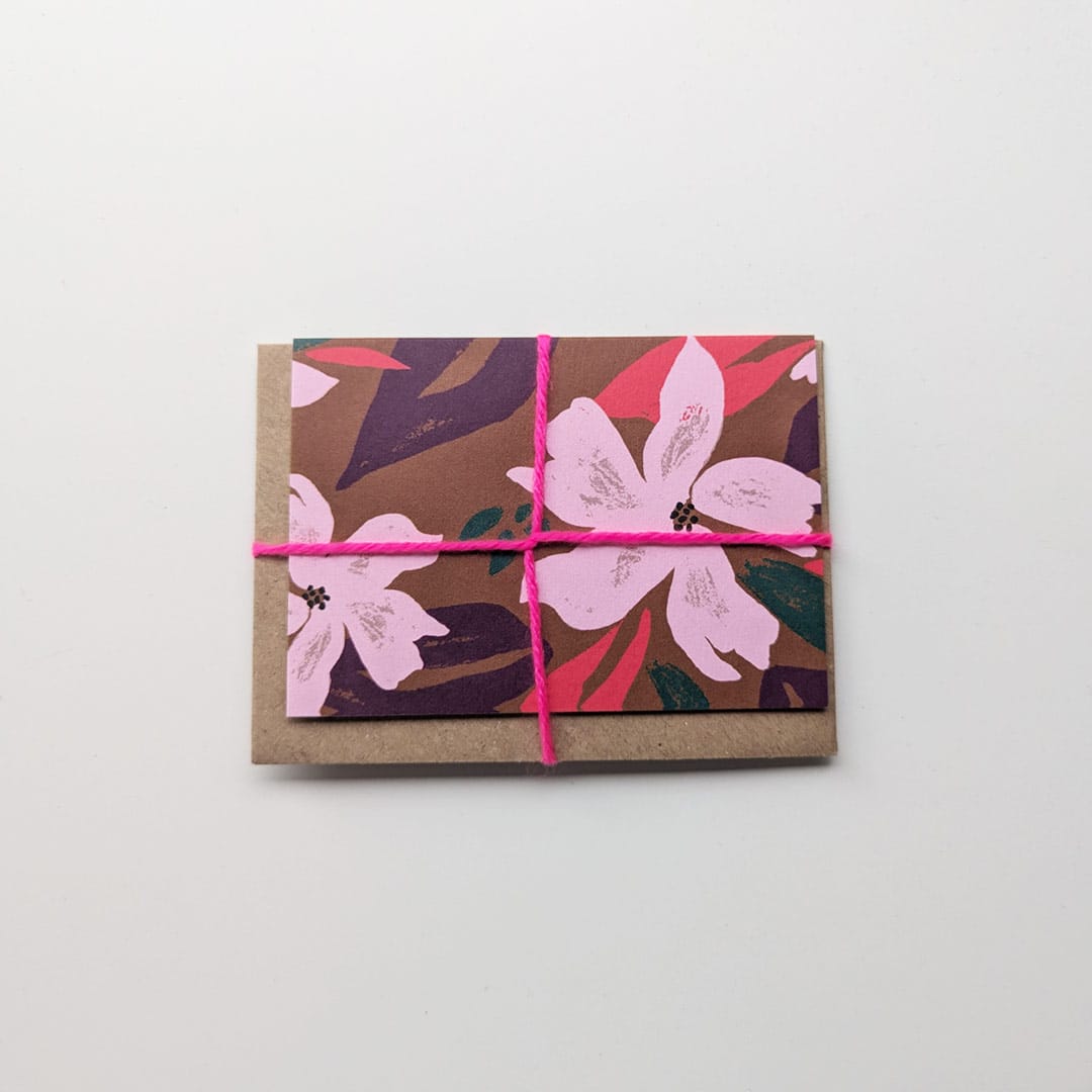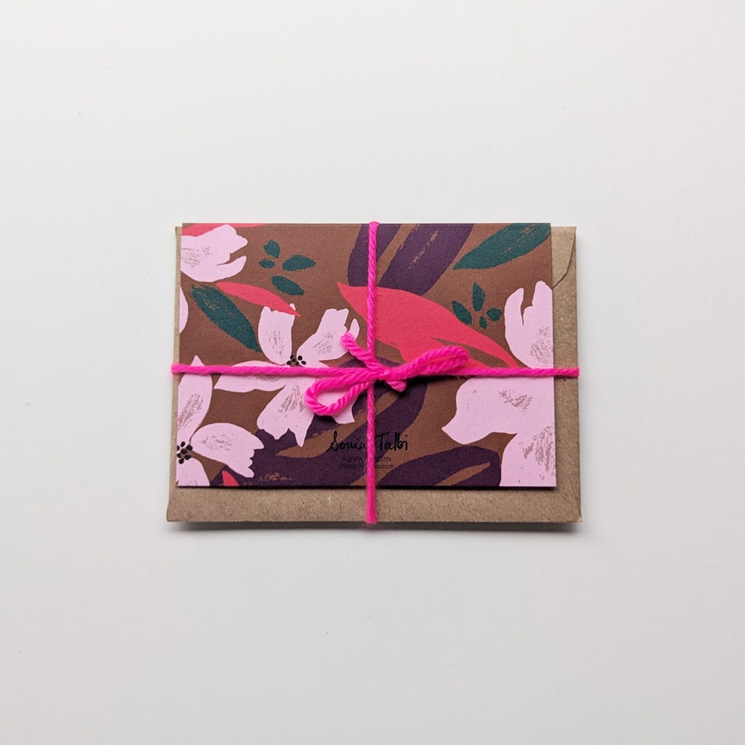 Mini carte postale Garden par Sonia Talbi aux motifs floraux vibrants.Garden – Mini carte postale 2 volets