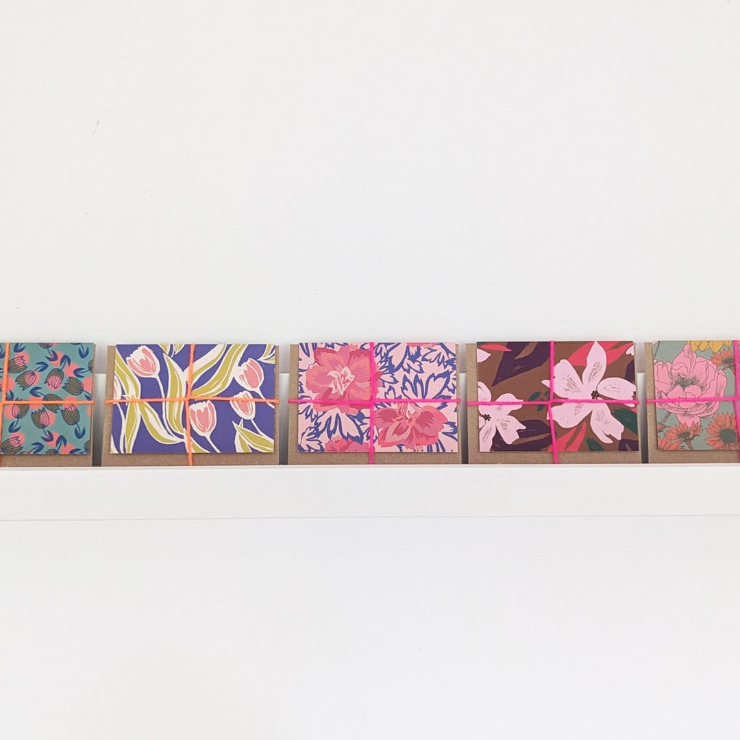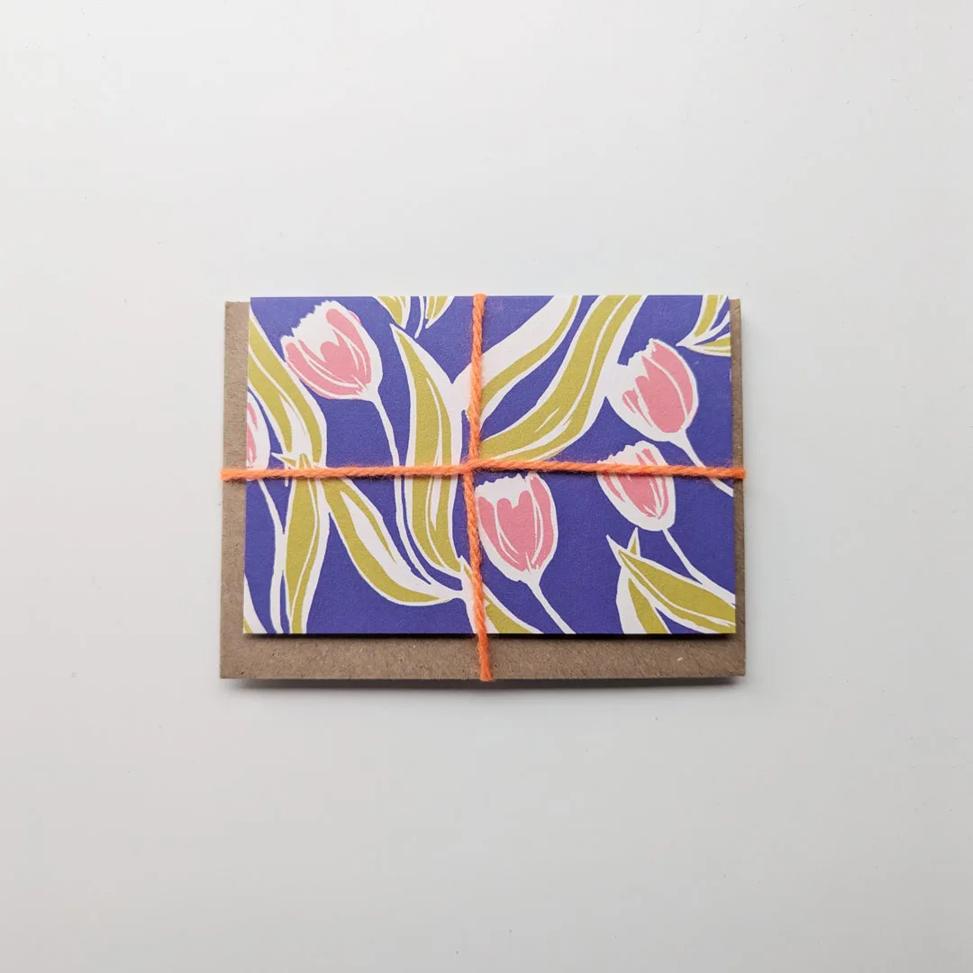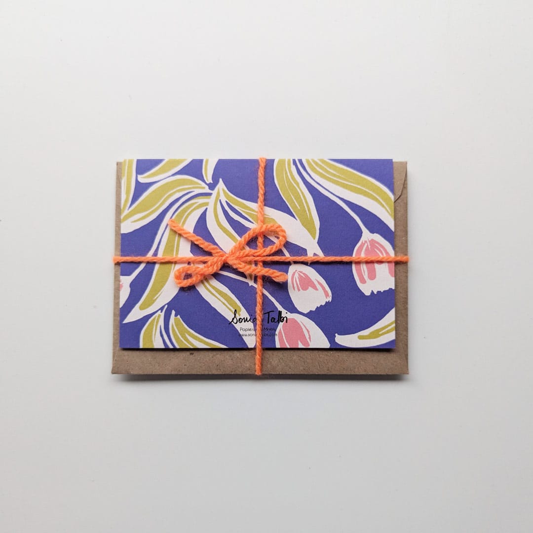 Image de mini carte postale Nottinghill, avec motifs floraux colorés et enveloppe kraft.Nottinghill – Mini carte postale 2 volets