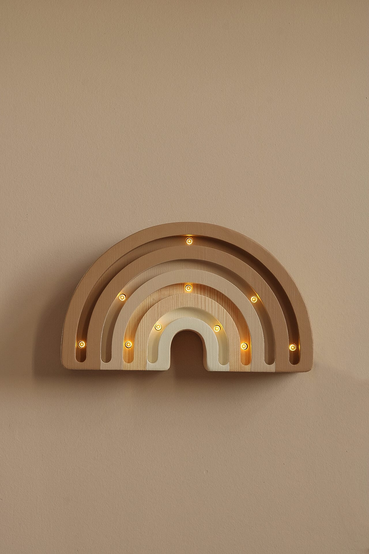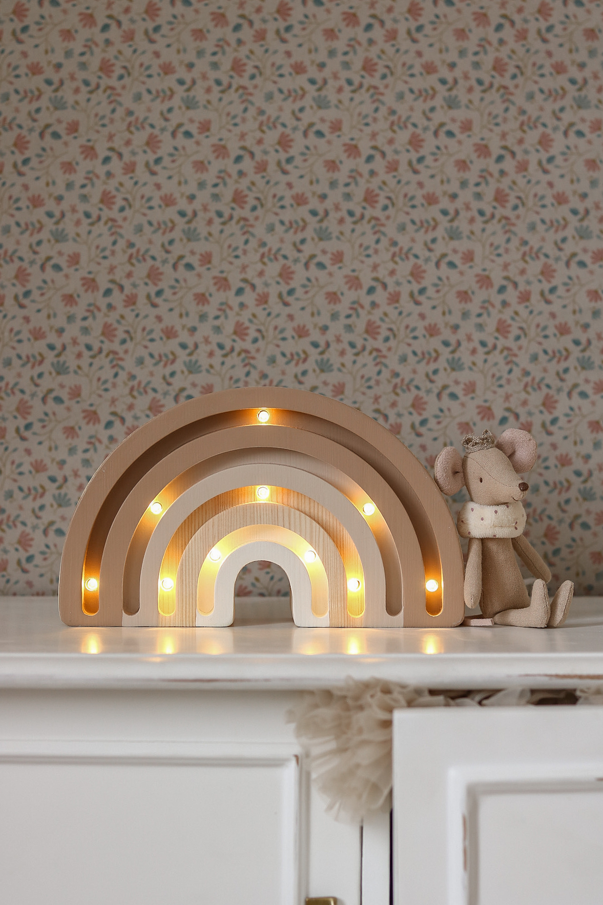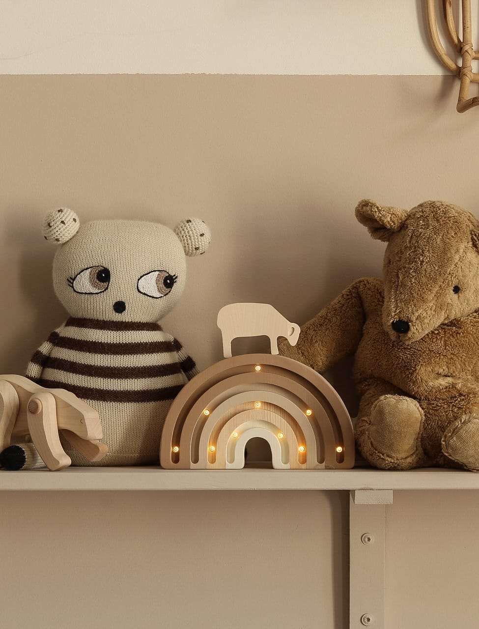 Little Lights décline son arc-en-ciel dans des tons neutres et naturels, allant d’une tendre teinte café à un blanc cassé élégant. Sur cette lampe, une partie non peinte laisse apparaître le bois, mettant ainsi à l’honneur la matière qui compose ce bel objet.