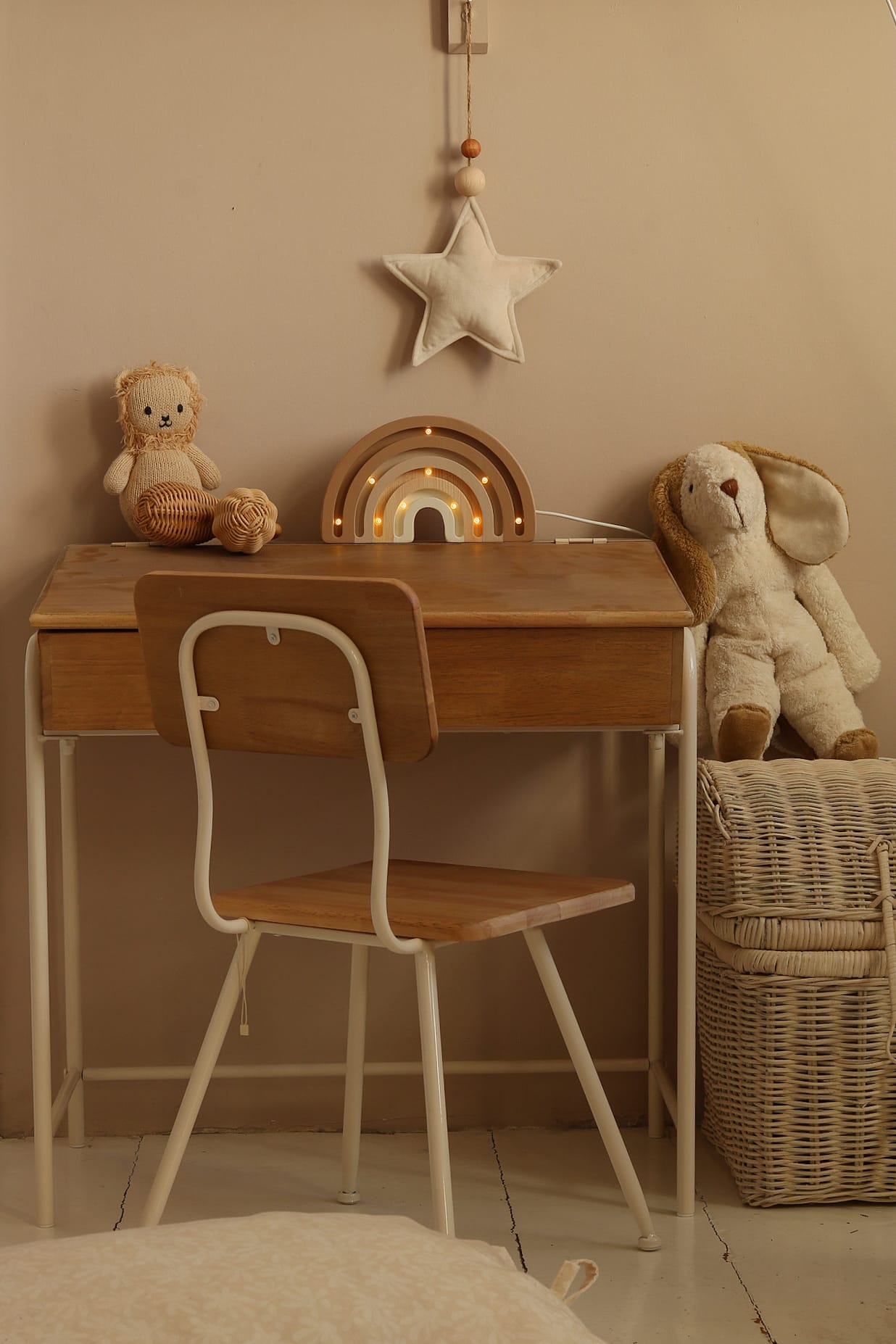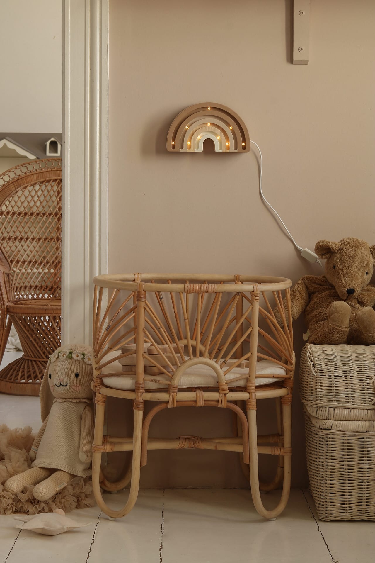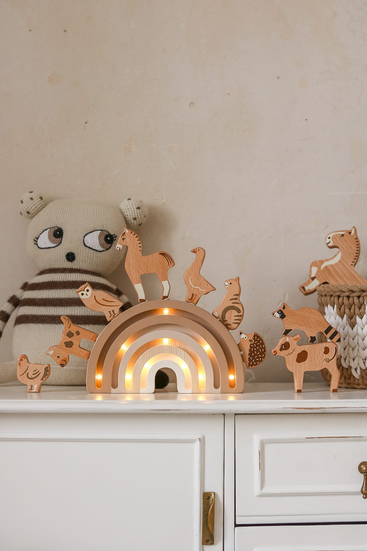Little Lights décline son arc-en-ciel dans des tons neutres et naturels, allant d’une tendre teinte café à un blanc cassé élégant. Sur cette lampe, une partie non peinte laisse apparaître le bois, mettant ainsi à l’honneur la matière qui compose ce bel objet.