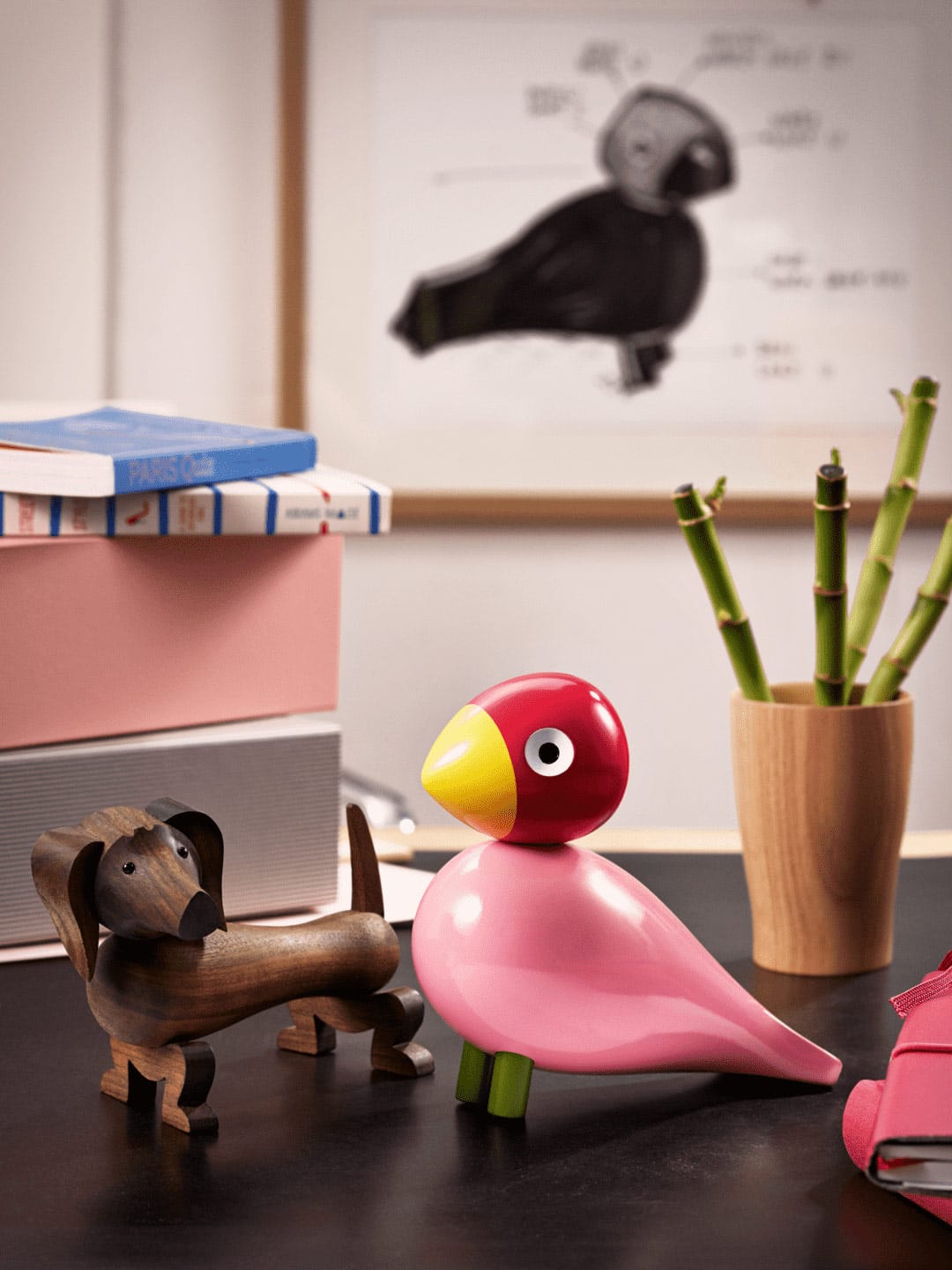 L’oiseau chanteur Ruth de Kay Bojesen trouve ses origines en 1950. Il s’agissait alors d’un modèle hommage à la belle fille du designer, non produit à l’époque. Cette pièce peinte à la main arbore une coloration éclatante et vibrante, avec une dominance de rose et de rouge. Intemporelle, elle reprend les codes épurés et simples du design danois, ainsi que les lignes arrondies joyeuses des créations de Kay Bojesen.