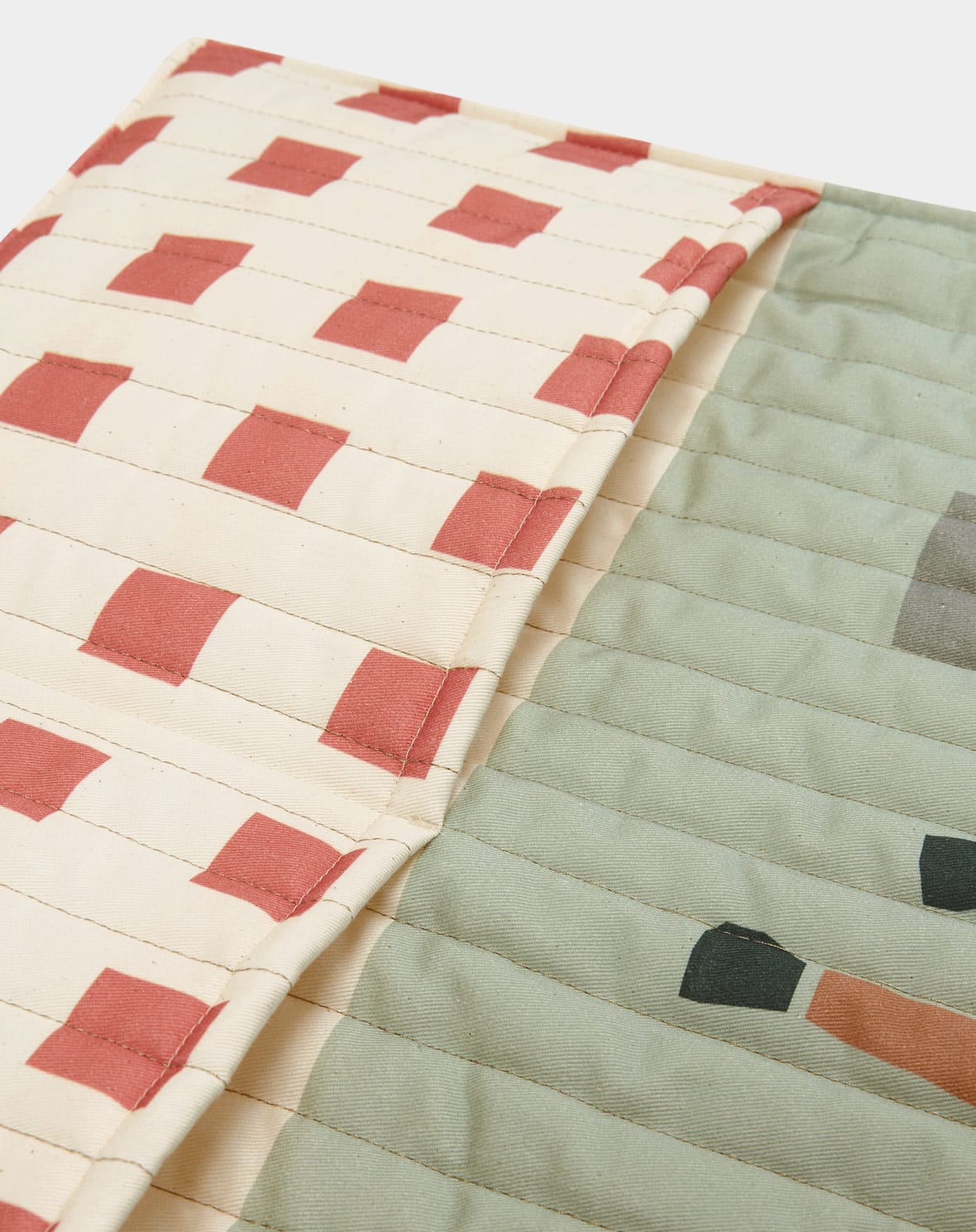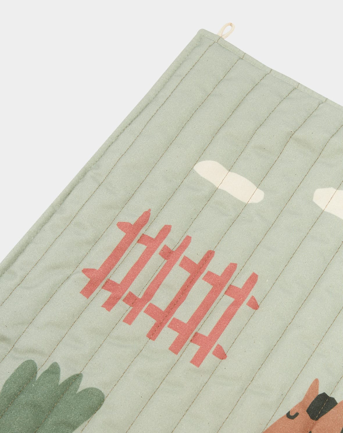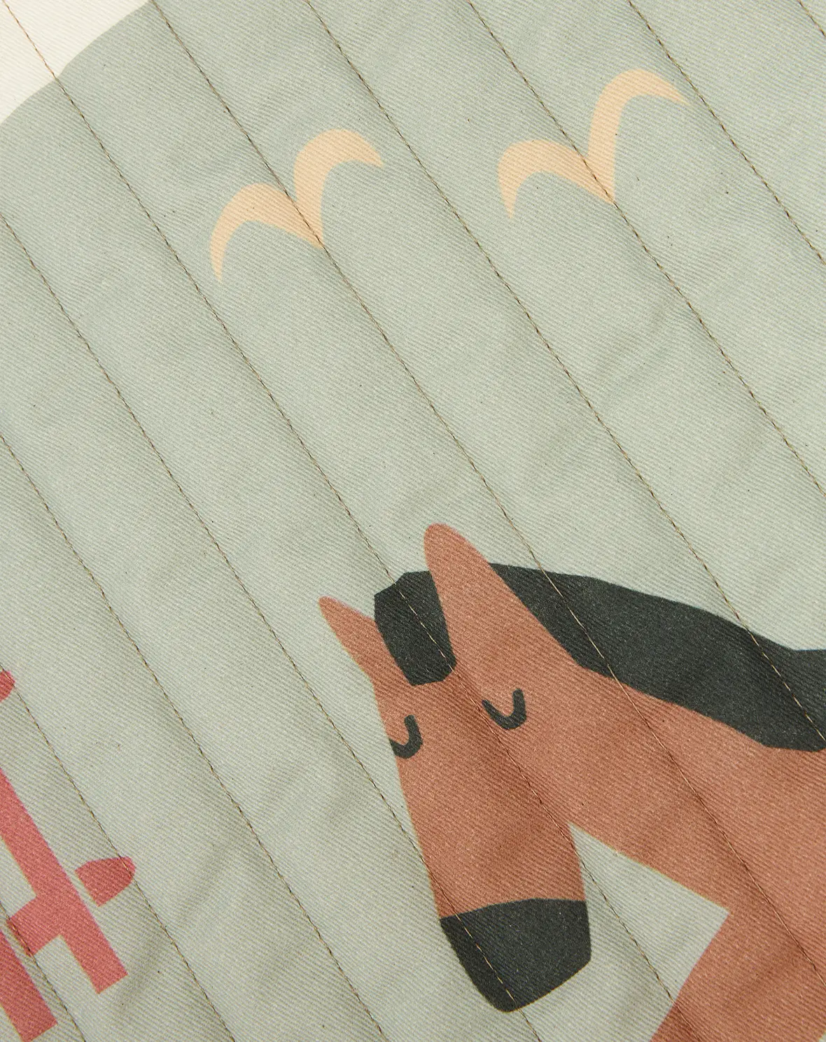 À l’image de toute la collection Vibes, cette pièce pratique fait entrer des motifs et de la couleur dans votre maison. Un cheval au pelage brun occupe le premier plan dans un paysage champêtre imagé. Dans un esprit minimaliste, une barrière, une pierre et quelques touffes d’herbe plantent le décor, sur un fond vert. Au niveau des poches, des carrés rouges sur fond blanc apportent une touche graphique et vibrante à l’ensemble.