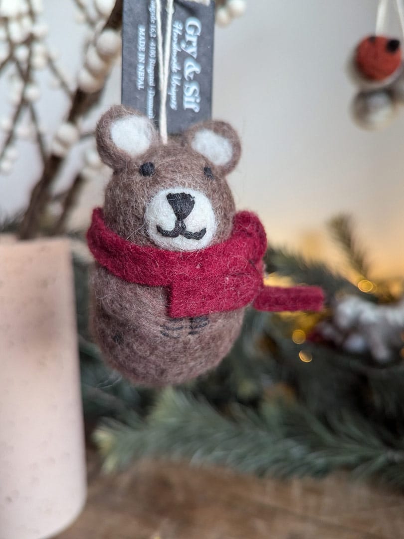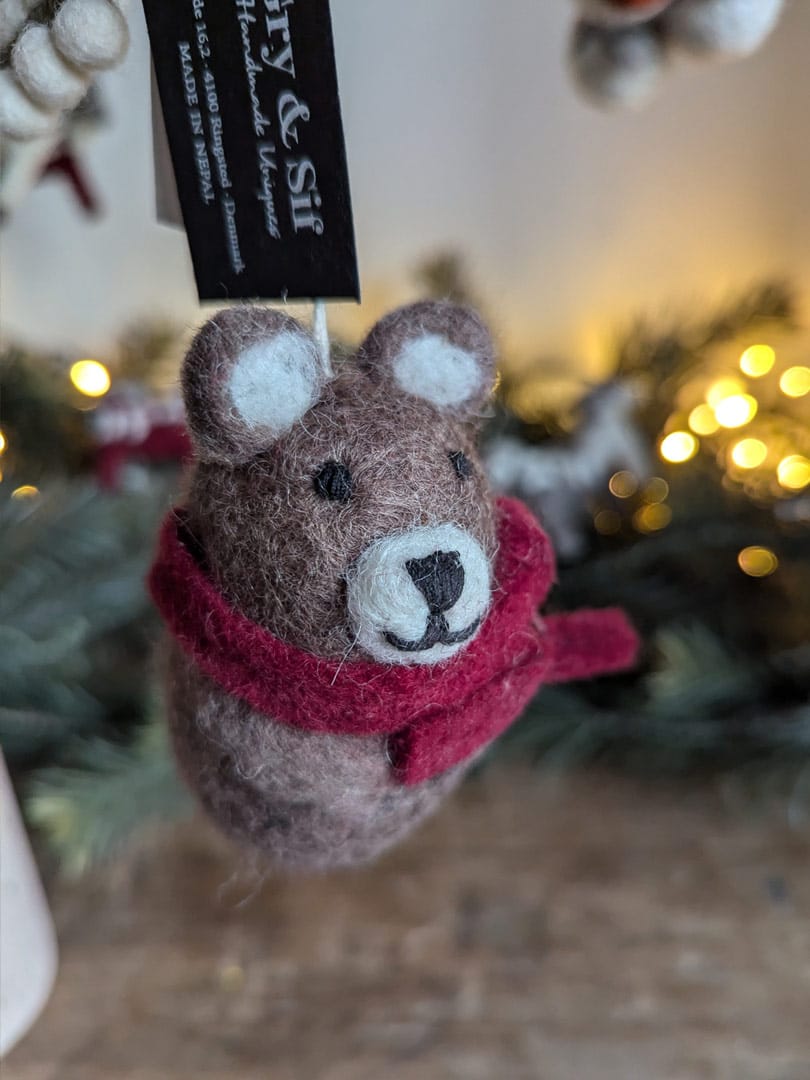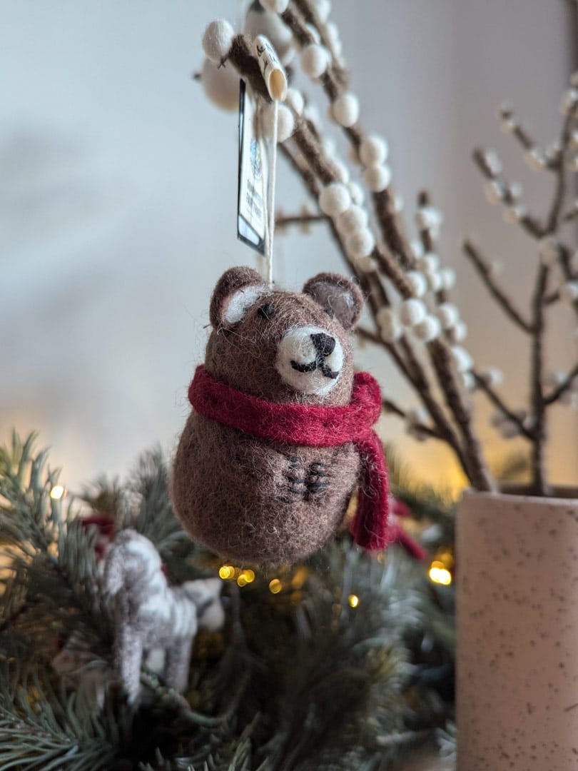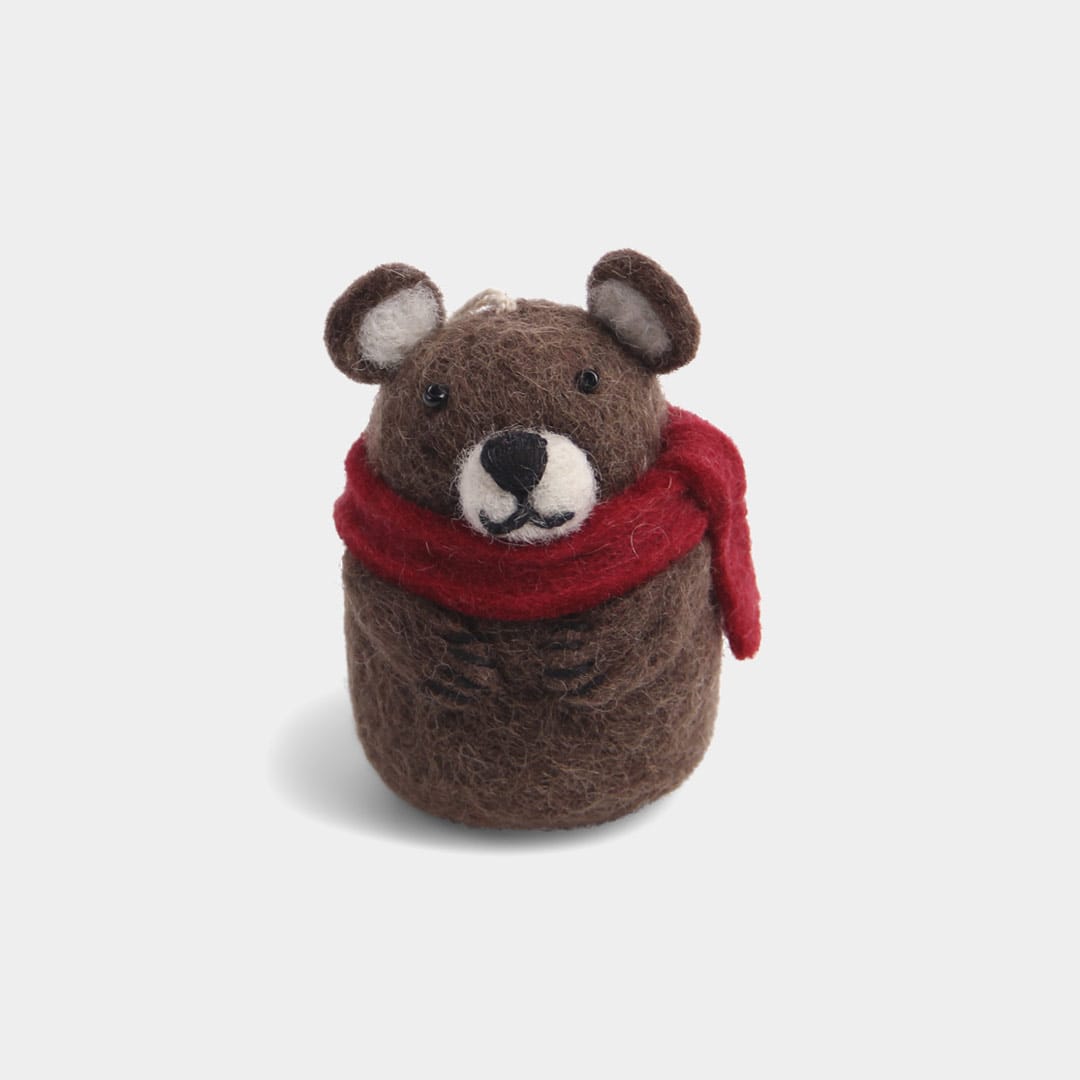 Chaque pièce est soigneusement fabriquée à la main, à partir de laine feutrée, dans le respect des traditions artisanales népalaises. Cet ours brun avec écharpe décore votre sapin de Noël, embellit une chambre d’enfant, ou apporte simplement sa note douce et ludique à n’importe quelle pièce.