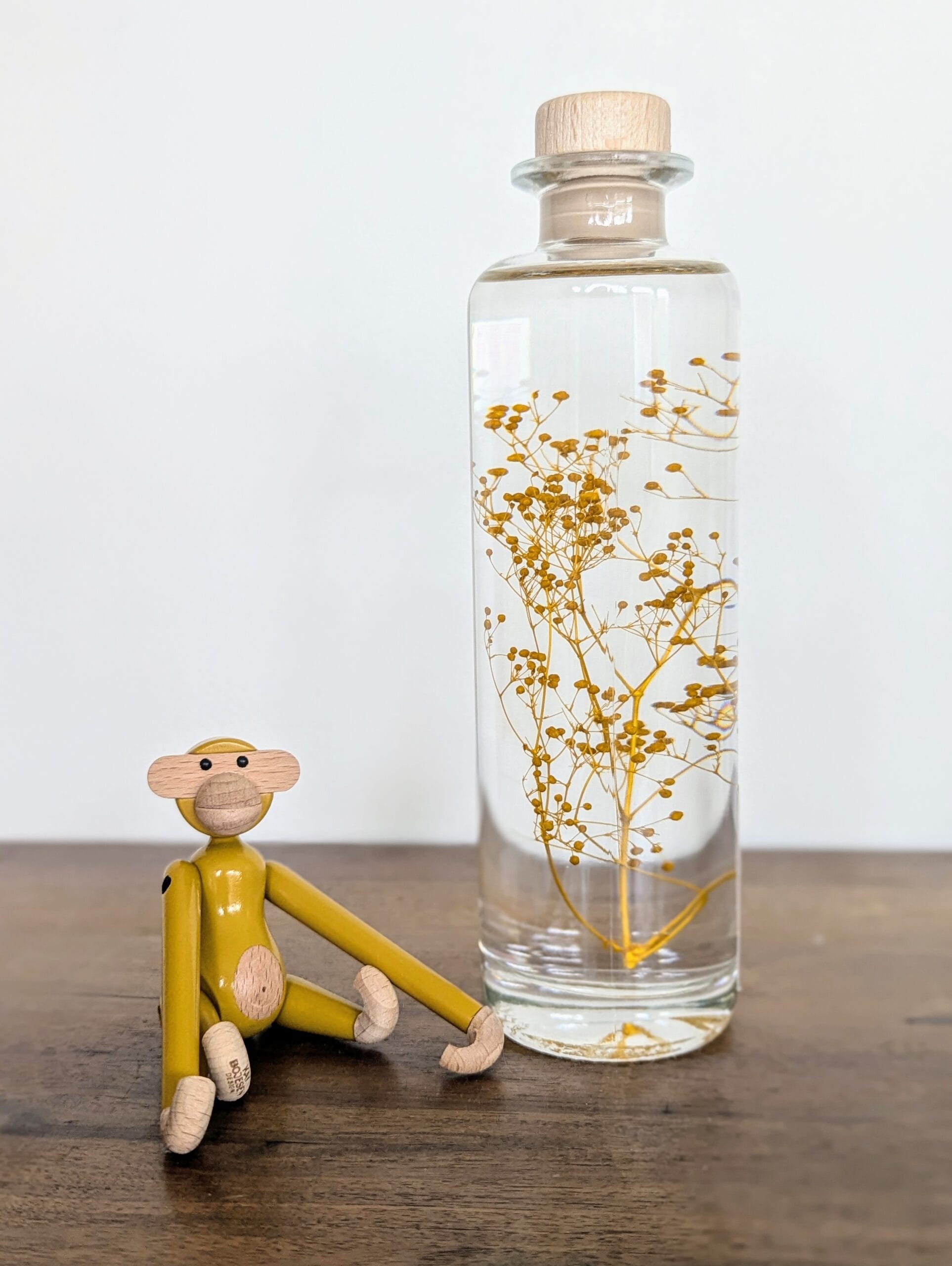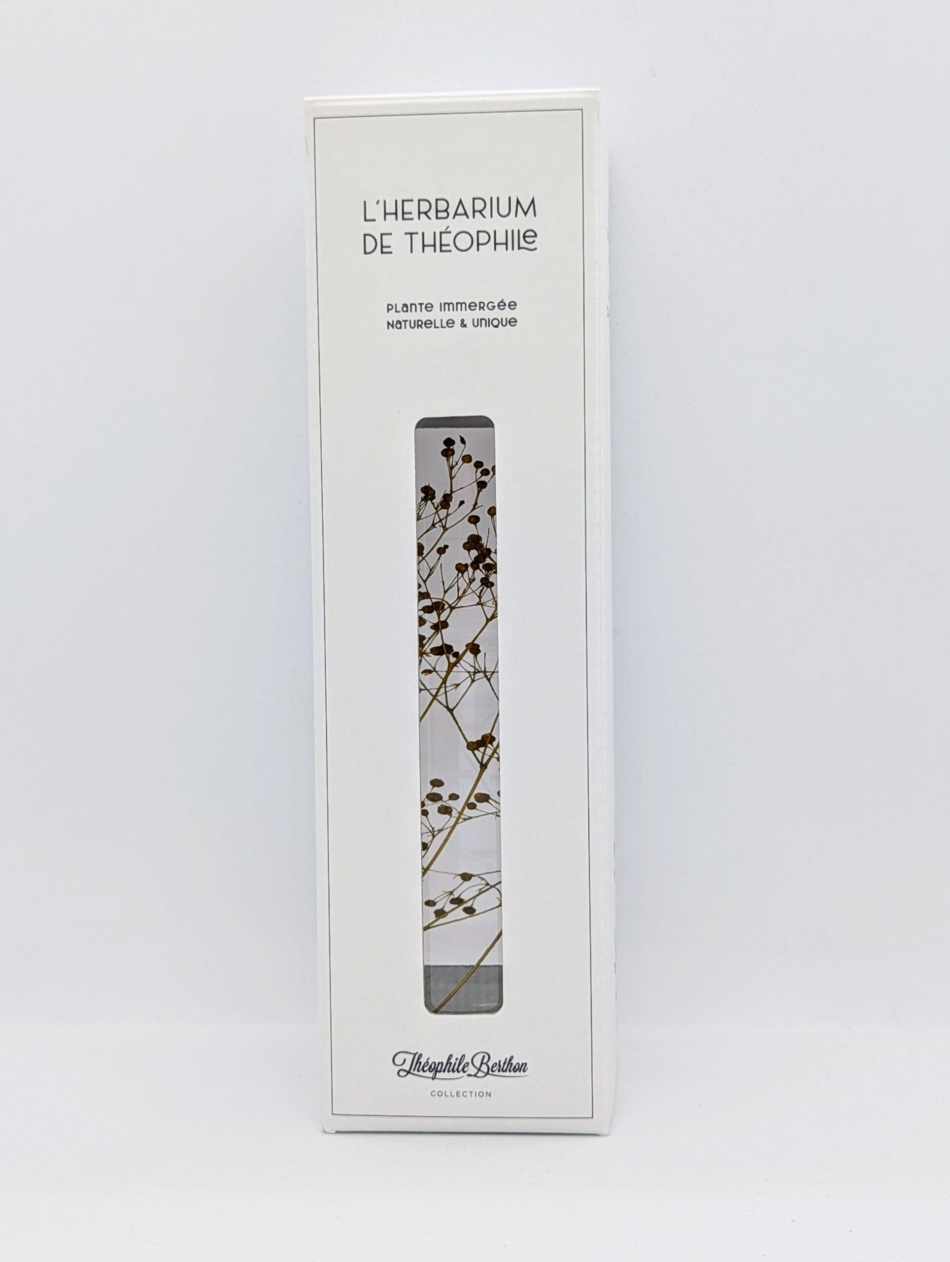 Dans ses ateliers du Sud de la France, la marque Théophile Berthon développe son Herbarium unique. Pour ce modèle, le gypsophile est mise en valeur dans un flacon d’apothicaire de 21 cm de haut. La plante immergée est insérée à la main dans un liquide de préservation translucide. Sa belle couleur safran attire la lumière et dépose une touche naturelle dans votre décor.
