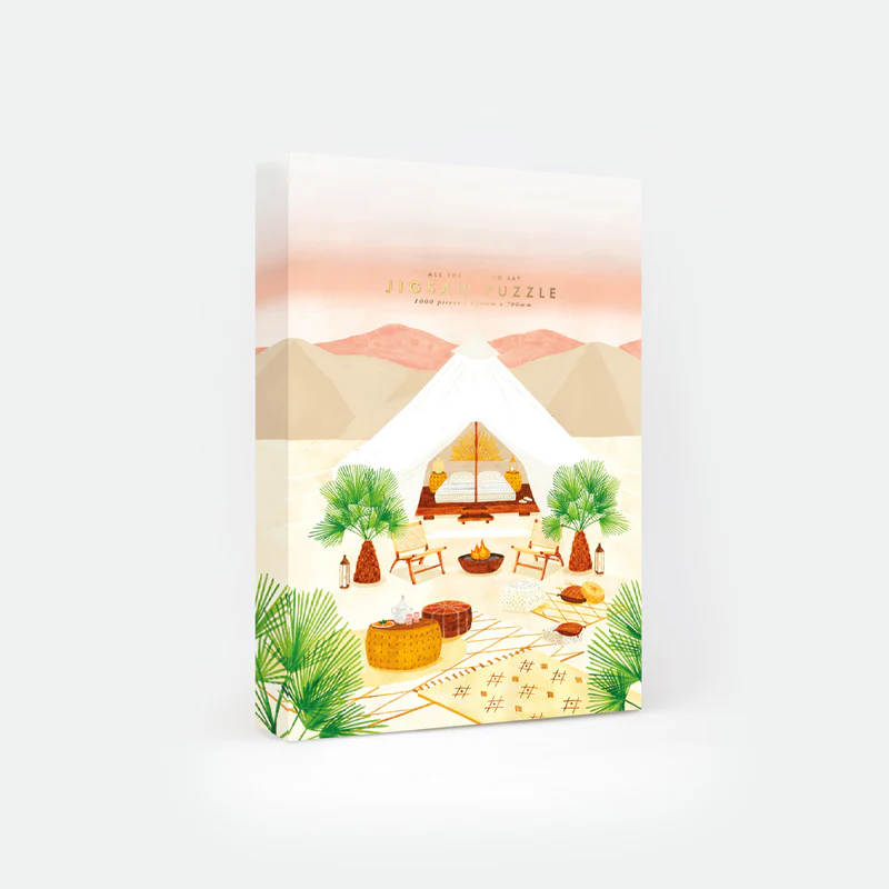 Le visuel Glamping de la marque All the ways to say se décline ici en un puzzle de 1 000 pièces. Représentant une confortable tente plantée au milieu du désert, il invite à rêver à un voyage au bout du monde.